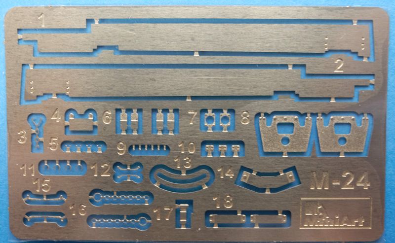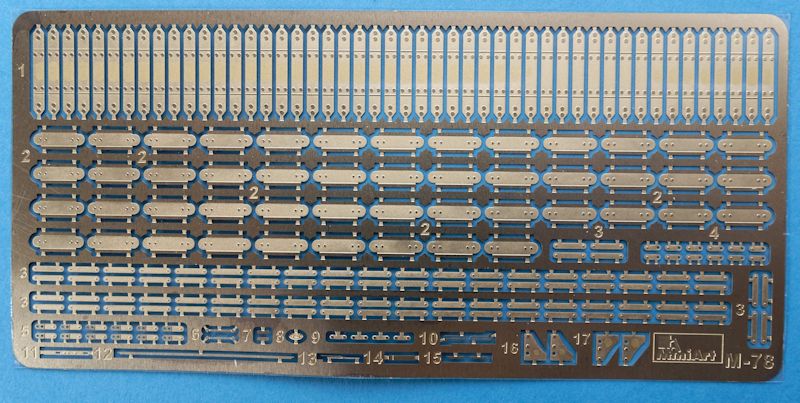 Der Karton, mit seinem gelungenen Titelbild, macht bereits schon Appetit auf den Inhalt. Nach dem Öffnen findet man eine riesige Anzahl an mausgrauen Spritzlingen, mit fein detaillierten Teilen, vor. Des Weiteren befinden sich, separat in einem kleinen Briefchen, zwei Bögen mit Ätzteilen. Schon fast ein separater Bausatz sind die Kettensegmente, die als Anfahrhilfe der beiden Hinterachsen auf die Räder montierbar sind oder optional an die Seite der Ladepritsche angebracht werden. Der kleinere Ätzbogen enthält die Zusatzteile für das Geschütz.