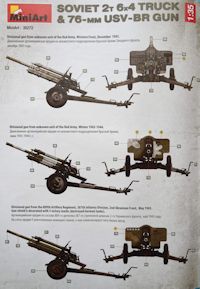 Bemalung: Die Farbangaben beziehen sich auf zwei Versionen für den LKW mit Geschütz sowie noch drei weiterer für das Sologeschütz. Bis auf eine Version eines Artillerieregiments in der Ukraine Mai 1945 sind alle anderen von unbekannten Einheiten zwischen 1941 und 1944.