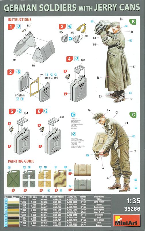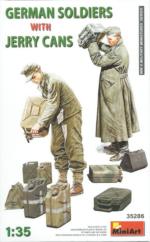 Wieder präsentiert uns der ukrainische Hersteller einen neuen Figurenbausatz. Dieses Mal handelt es sich um zwei deutsche Soldaten, die in natürlichen Posen mit Kraftstoff- oder Wasserkanistern hantieren. Der Karton des Bausatzes ist im üblichen Stil gehalten und zeigt sehr schön den Inhalt des Figurenbausatzes, der neben zwei Wasserkanistern und vier regulären 20 Liter Benzinkanistern auch noch zwei 20 Liter Kraftstoffbehälter in den dreieckigen Kanistern enthält.