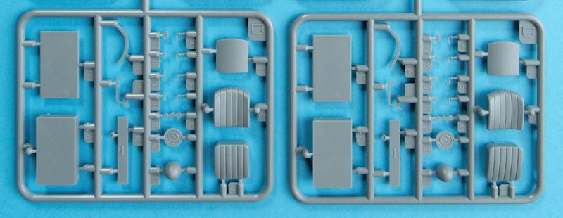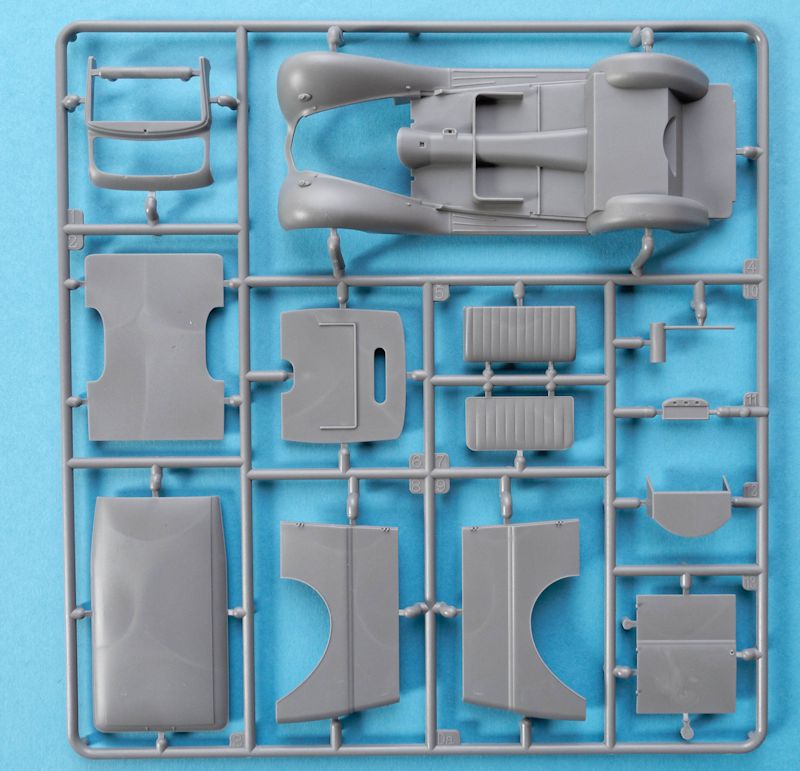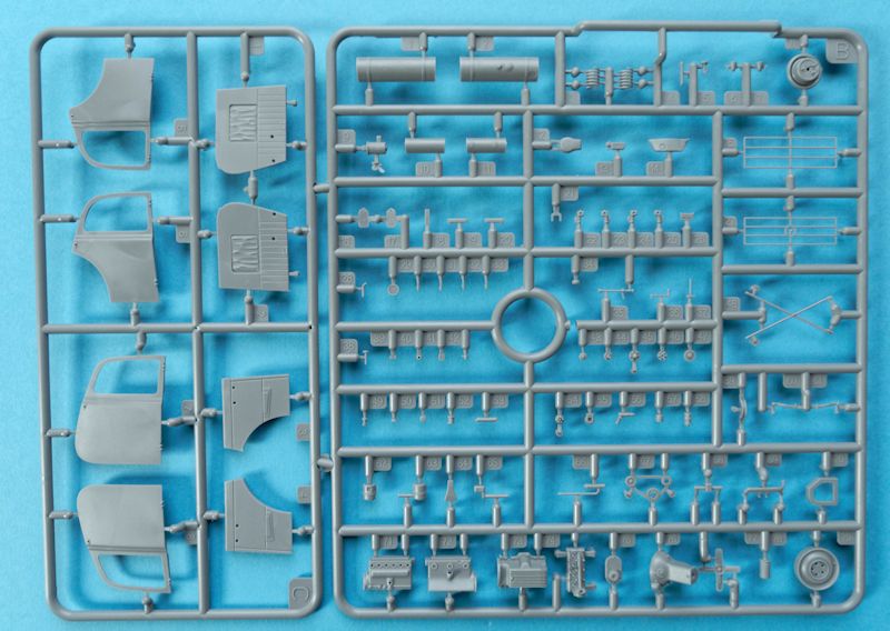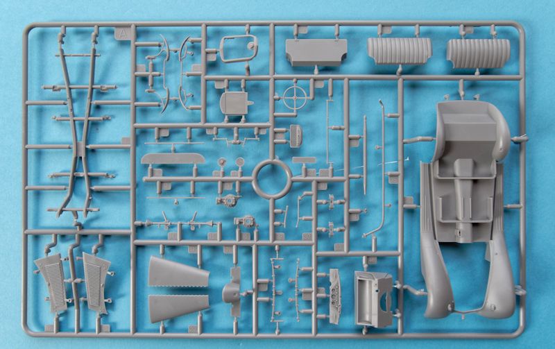 Die rund 12 Spritzlinge, aus grauem Kunststoff, sind hervorragend detailliert und sauber gefertigt. Störende Auswerfer oder Fischhäute sind nicht zu finden. Dies ist man ja inzwischen bereits gewohnt, dass auf hohe Qualität und gute Passgenauigkeit geachtet wird. Hier sind z.B. die Räder zu erwähnen, die aus mehreren Reifenscheiben montiert werden und das Profil sehr gut darstellen. An den Flanken befindet sich sogar der Hersteller und für die Felgen liegen separate Radkappen bei. Genau mit solchen kleinen Details lassen sich beispielsweise verlorengegangene Radkappen darstellen, die ein Modell noch interessanter machen.