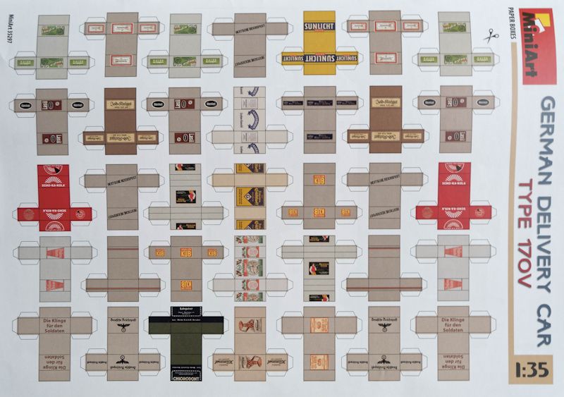 Gegenüber den zivilen Versionen unterscheidet sich diese Militärversion nur durch den geänderten Ätzbogen, Farbangaben und die Decals. Als tolle Ergänzung gibt es hier einen DIN A4 Bogen aus dickerem Papier, der mit insgesamt 35 Kartons, unterschiedliche Produkte bewirbt. Diese wurden so abgestimmt, dass man Produkte findet, die auch speziell für Soldaten bestimmt sind. So gibt es von Rasierklingen über Seife, Waschmittel, Zahnpasta auch Süßstoff und Scho-Ka-Kola.