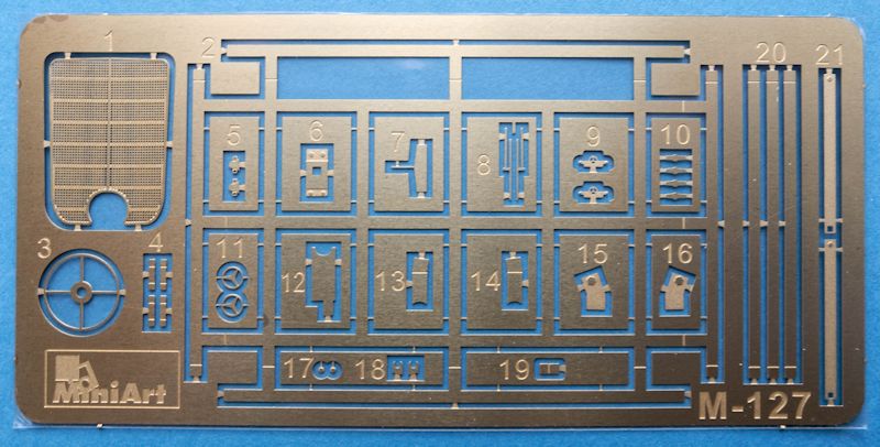 Gegenüber der zivilen Version gibt es hier nun einen geänderten Ätzteilebogen, der unter anderem die Teile für den Dachträger enthält, auf dem dann z.B. Kartons befestigt werden können. Ein besonderes Schmankerl dürfte wohl der Kühlergrill sein. Dieser ist wirklich hochfein mit seiner Gitterstruktur gefertigt und ist in dieser Fertigungsqualität aus Kunststoff so einfach nicht umsetzbar.