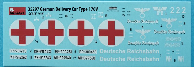 Anleitung/Bemalung: Die Bauanleitung enthält vier Farbvarianten die zwei Wehrmachts-, eine Reichspost- und eine Reichsbahnversion darstellen. Bei den beiden letzteren entfällt dann der Tarnscheinwerfer. Der Decalbogen ist sauber und randscharf gefertigt. Die Reifendruckmarkierungen sind sowohl in Schwarz als auch in Weiß vorhanden, je nach Farbwahl. Für Mini Art typisch beziehen sich die Farbangaben auf die Sortimente von sechs bekannten Herstellern.