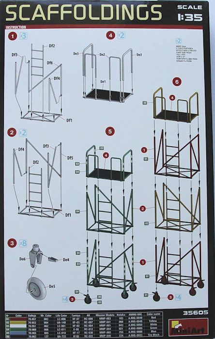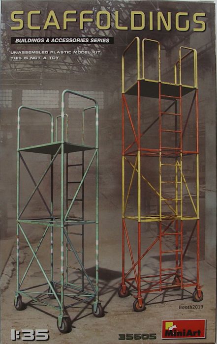 MiniArt hat bei diesem kleinen Bausatz für die Dioramenbauer wieder den richtigen "Riecher" gehabt. Der MiniArt- typische Faltkarton für kleine Bausätze enthält zwei verschieden große Arbeitsbühnen, wie sie im vergangenen Jahrhundert in jeder Werkhalle verwendet wurden. Das Deckbild wurde sehr gut gestaltet.