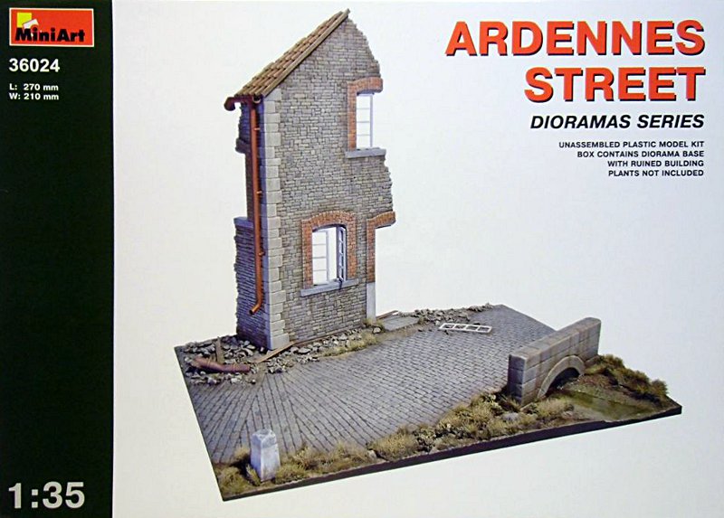 Als aktuelle Neuheit in der 1:35 Dioramen Serie hält der ukrainische Plastikmodellbau Hersteller MINIART eine Hausruine mit Straßensegment zur Zeit der Ardennen Offensive parat. Im farbig gut illustrierten Stülpkarton befinden sich zwei Gießrahmen mit 56-, sauber in grauem Plastik abgespritzten Einzelteilen und 10- im Tiefziehverfahren herstellten Plastikteilen.