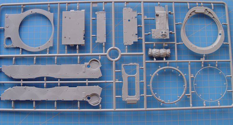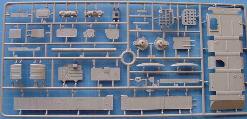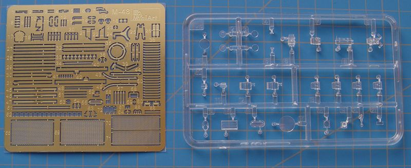 Zwei kleine Platinen mit Ätzteilen für die wichtigsten Bauteile, diese man aus einen Ätzteil darstellen muss. Wie Lüftergitter, Griffteile oder Werkzeughalter. Ein kleiner Bogen aus Klarplastik- für die Scheinwerfer und Sichtblöcke der Periskope.