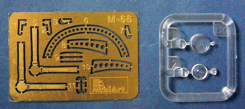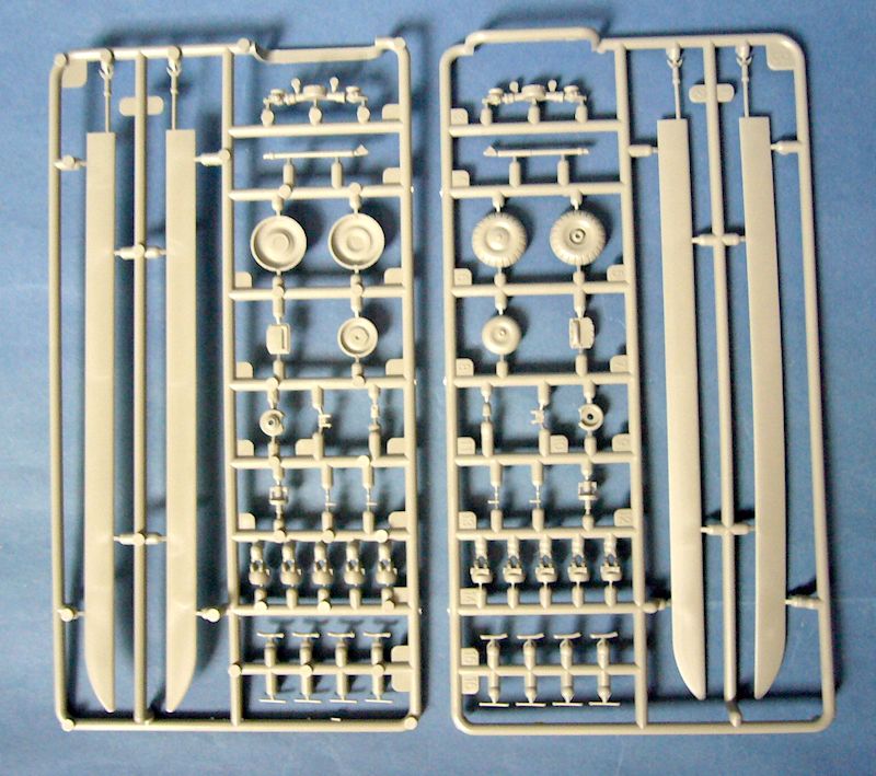 Der Bausatz, in der Miniart üblichen Box mit sehr schönem Deckelbild, beinhaltet acht Spritzlinge aus hellgrauem Plastik sowie einen kleinen Spritzling mit Klarsichtteilen, einen kleinen Ätzteilebogen sowie Abziehbildern. Die genaue Teilezuordnung sieht wie folgt aus: