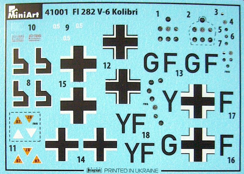 Bemalung: Die Kennungen für den Hubschrauber, für die Instrumentenskalen und Wartungshinweise sind sauber auf einem kleinen Abziehbilderbogen aufgedruckt. Darüber hinaus sind auf vier Seiten des Bauplans ganzseitige Farbabbildungen von unterschiedlichen Bemalungsvarianten zu finden, wobei alle allerdings die gleiche Typenkennung aufweisen:
