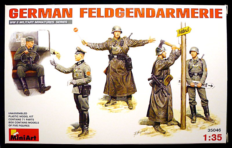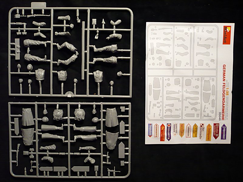 Der sauber gravierte Bausatz besteht aus 4 Feldgendarmen und einem Kraftfahrer und den auf dem Deckelbild gezeigtem Holzpfahl. Ausgestattet mit allen Utensilien, sollte es hier an nichts fehlen. Die Schilder sind auf einem beiliegendem Teilenummerierungsbeiblatt mit aufgedruckt.