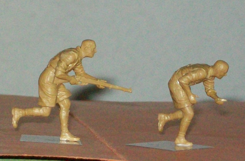 Damit man die Bewegung der Figuren besser beurteilen kann, habe ich noch keine Ausrüstungsgegenstände und nur wenige Waffen den Figuren auf den Fotos mitgegeben. Wie man sieht bedarf es keiner aufwendigen Spachtelarbeiten nach dem Zusammenkleben der Figuren.