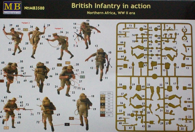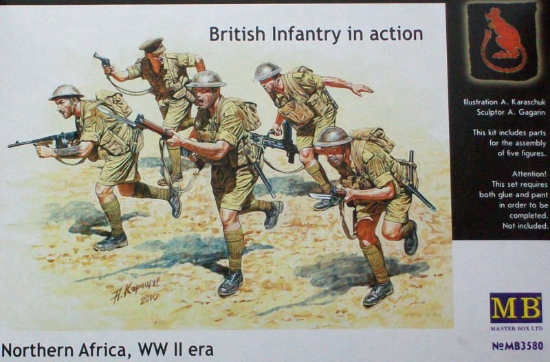 Ein neuer Figurensatz von MASTER BOX LTD. Er beinhaltet fünf vorwärts stürmende englische Infanteristen in den Wüstenuniformen der 8th Armee in Nordafrika. Es sind vier Soldaten und ein Offizier. Zwei sind mit einem Lee-Enfield-Karabiner mit Bajonett, einer mit einer Thompson MP und der letzte mit einem Bren MG ausgerüstet. Der Offizier trägt einen Revolver in der Hand. Die Figuren sind in der stürmenden Bewegung gut getroffen. Es liegen alle erforderlichen Ausrüstungsgegenstände dem Bausatz bei.
