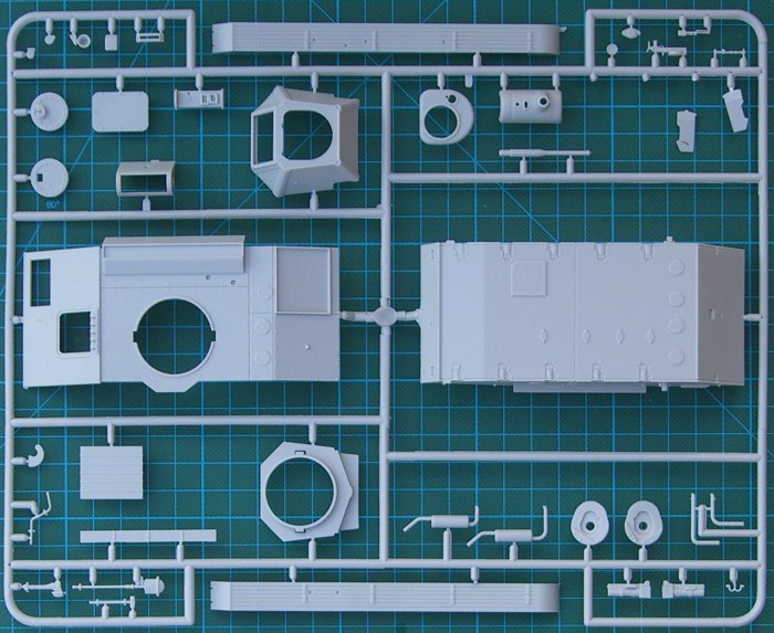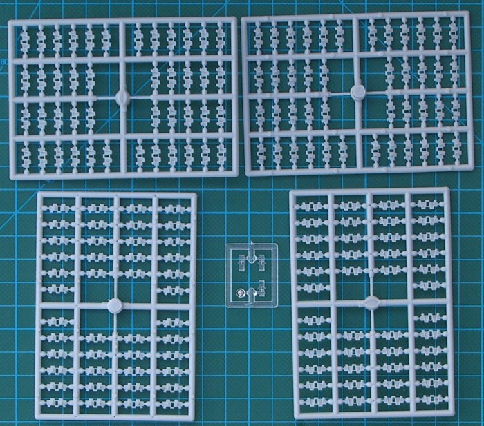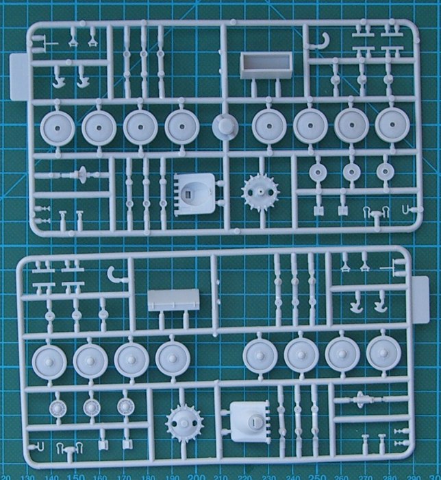 Die Bauteile für den Panzer sind stimmig und für die Kette gibt es ein paar Gießäste mit Einzelkettengliedern. Schön ist auch die einteilige Panzerwanne. Hier muss nichts mehr ausgerichtet und verklebt werden. Für den Scheinwerfer (wird nur bei einem Fahrzeug benötigt) und die Periskope gibt es einen kleinen Gießast aus Klarsichtmaterial. Die Decals sind auf hellblauem Trägerpapier versatzfrei gedruckt.