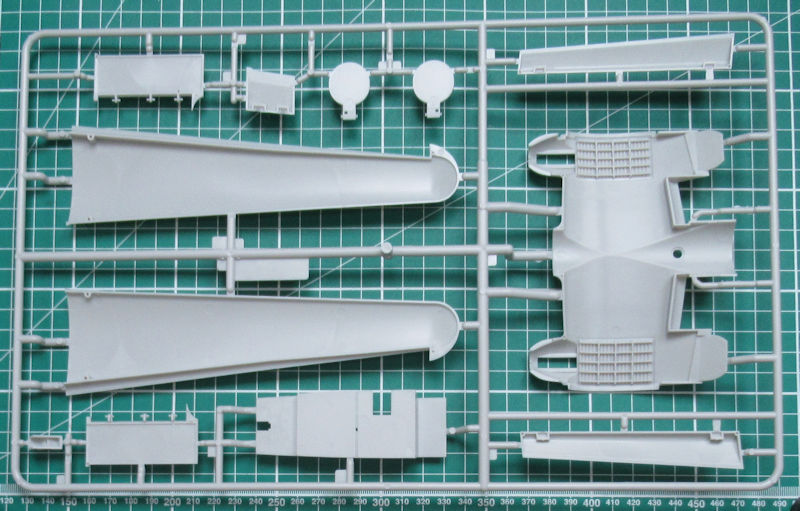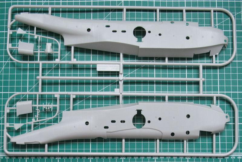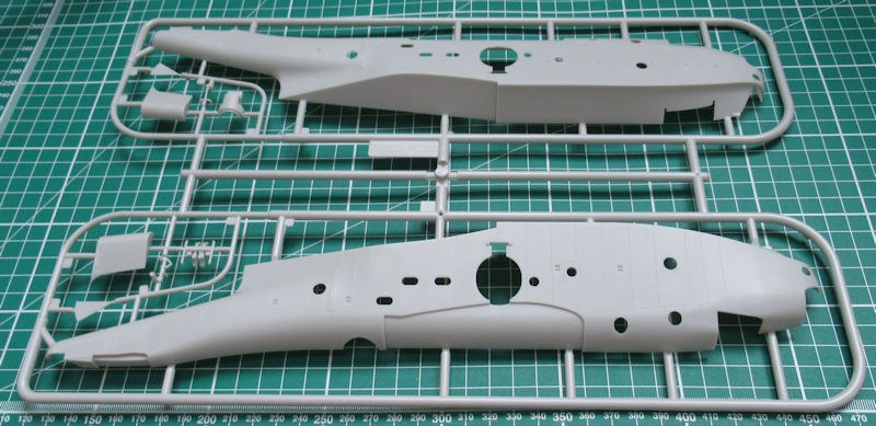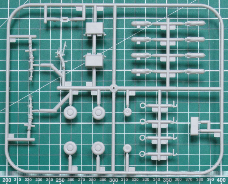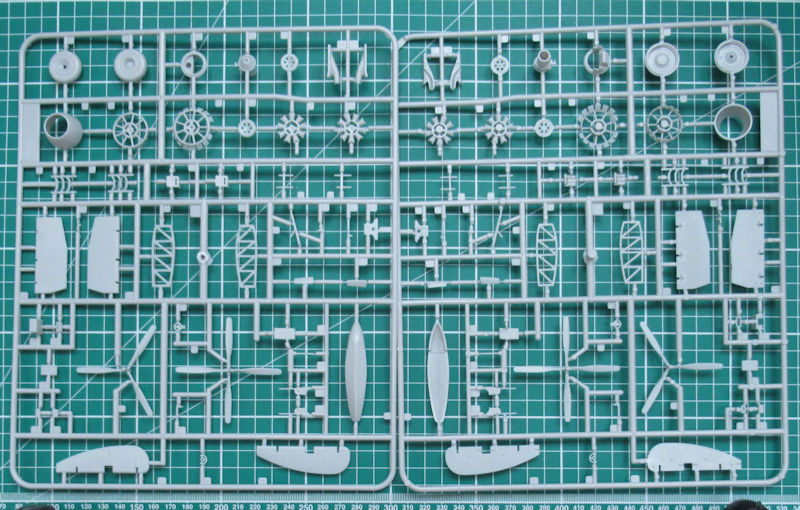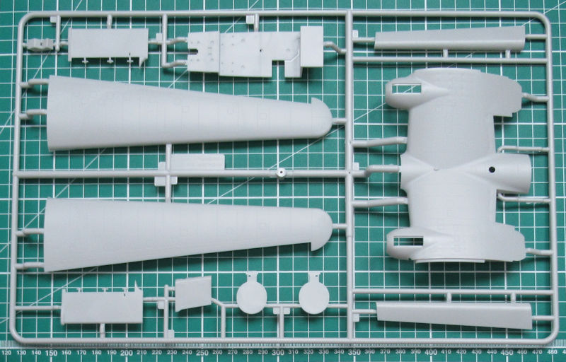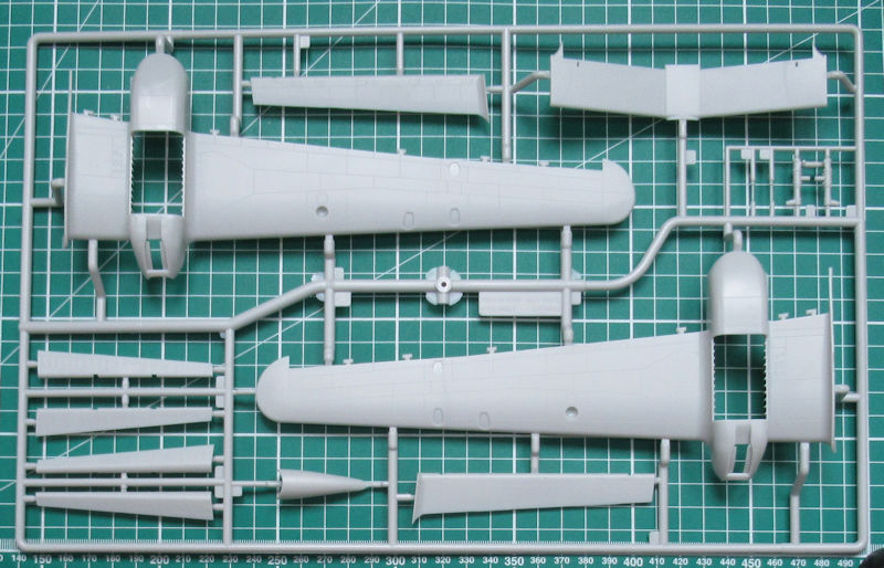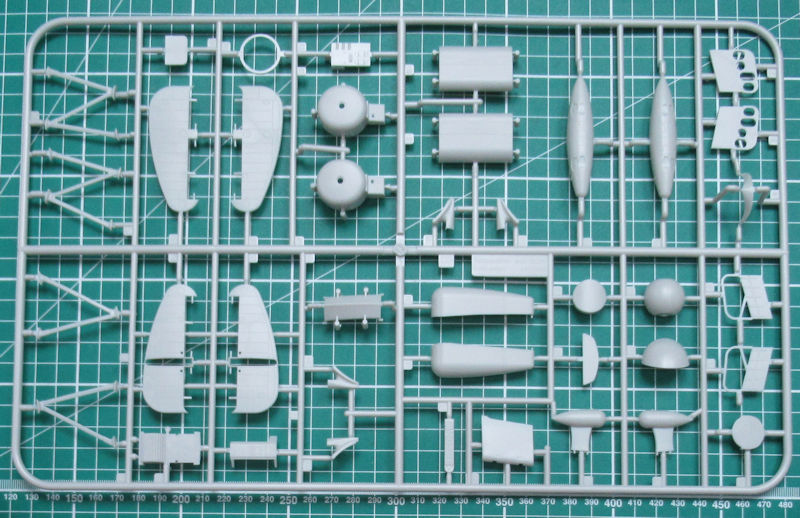 In dem randvollem Stülpkarton befinden sich gut verpackt sieben hellgraue Spritzlinge mit 150 Bauteilen, einem klarem Rahmen mit 33 Teilen, einen kleinen Decalbogen und die übersichtliche Bauanleitung. Ein paar Teile sind für andere Versionen bestimmt und wandern in die Restekiste. Gegenüber der PBM-5A gibt es einen weiteren Spritzling mit Teilen für das Hilfsfahrwerk und die Wasserbomben. Die Teile besitzen ordentliche Strukturen und feine Gravuren. Einfach typischer Formenbau "Made in China".