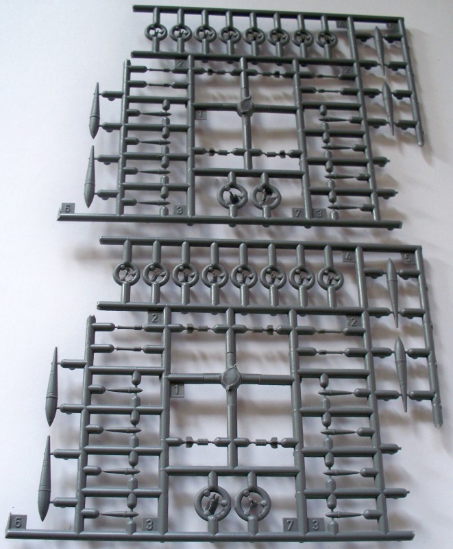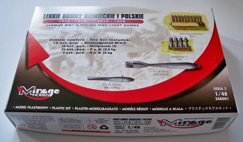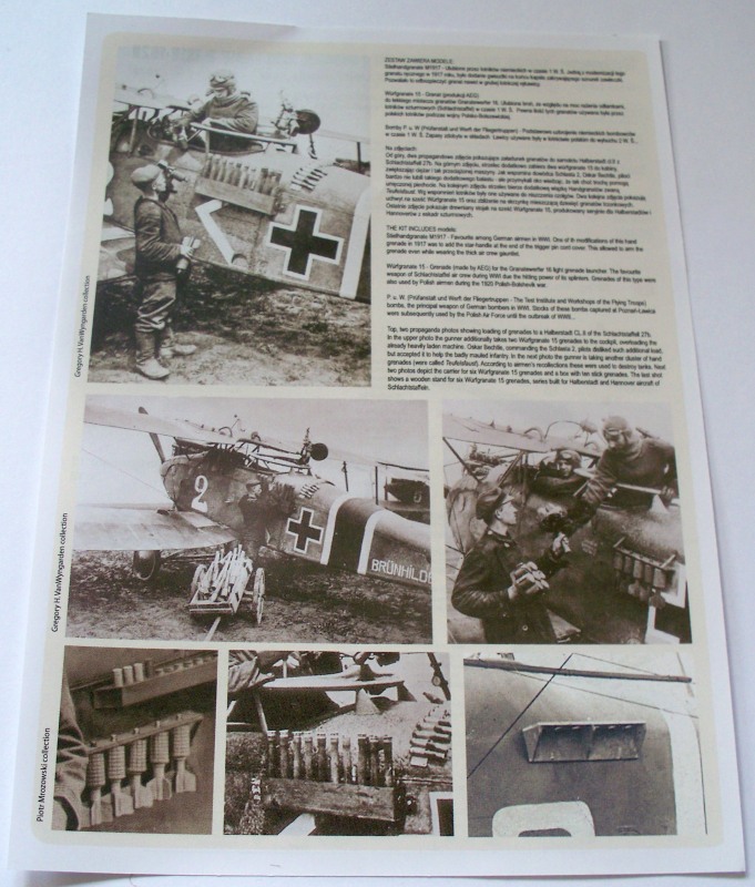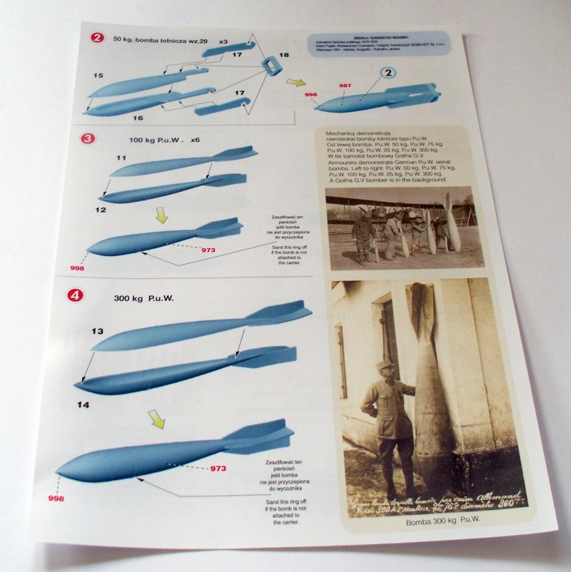 Bausätze: Will man das Modell der Halberstadt CL II von MIRAGE mit diesen Waffen bestücken, sollten der Satz: Serie 2/ Seriennummer 248001 erworben werden. In diesem Bausatz befinden sich sehr schön ausgeformt genau diese Granaten. Diese sind am vorderen und hinteren Ende am Spritzrahmen befestigt, so das Entgratungen nicht nötig sind. Der Rest beinhaltet 12,5 bzw. 75 kg Bomben.