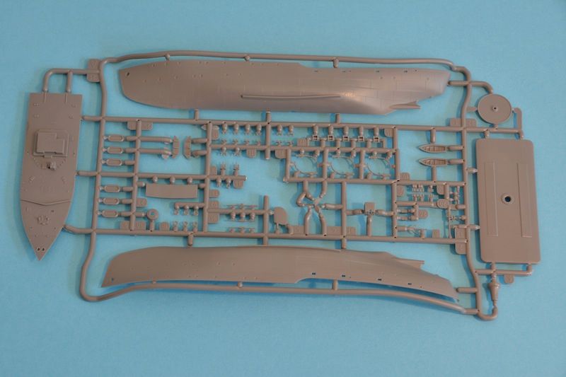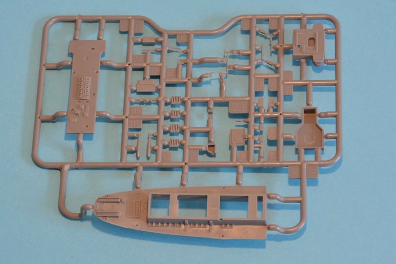 Bausatz: Der Bausatz von ,,Mirage Hobby'' (Bild 1) besteht aus zirka 170 Teilen auf drei Spritzlingen. Dazu gibt es einen kleinen Bogen mit Abziehbildern, aber keine Fotoätzteile. Ein passender Fotoätzbogen kann von White Ensign Models bestellt werden. (PE 35171) Die Teile des Bausatzes sind sauber und fein gegossen und es gibt fast kein Grat.