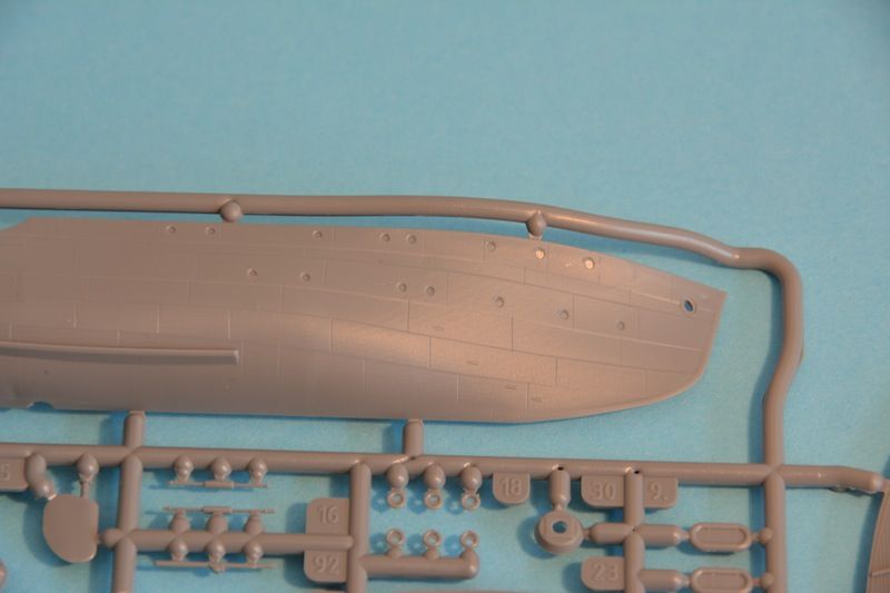 Gussast A (Bild 2) Der Rumpf besteht aus einem Steuerbordteil und einem Backbordteil, in die die Seitenbeplattung,auch unter der Wasserlinie, schön eingraviert ist, was bei vielen Bausätzen nicht der Fall ist. Die Kimmkiele sind ein wenig grob, aber es dürfte nicht schwer sein, sie durch dünnere aus Plastik oder Metall zu ersetzen. (Bild 3)