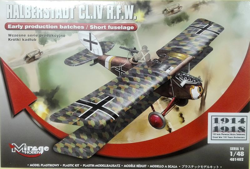 Bausatz: Mirage Hobby hat Ende 2016 die Halberstadt CL.IV in der kurzen Version aus einer neuen Form wieder neu aufgelegt. Auch einige Teile wurden ergänzt. Geliefert wird der Bausatz im praktischen Stülpkarton. Anlässlich des 100. Jahrestages des ersten Weltkriegs zeigt das Deckelbild eine Erdkampfszene, da die Halberstadt ja hauptsächlich als Erdkampfflugzeug eingesetzt wurde.