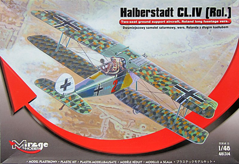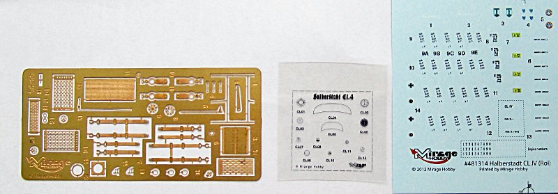 Bausatz: Nach einigen Halberstadt CL.II Editionen war es folgerichtig, dass Mirage dem Vorbild folgte und eine Cl.IV herausgebracht hat. Der Bausatz enthält neben dem bereits bekannten Flügelspritzling und mehreren Gießrahmen für die Kleinteile einen komplett neuen Rahmen mit den Teilen für die Halberstadt Cl.IV. Im Bausatz gibt es auch einen kleinen Bogen mit Fotoätzteilen, die für Gurte, MG-Kühlmäntel und einige Details Verwendung finden. Ein Acetatfilm ist für die Instrumentierung und den Windschutz beigefügt.