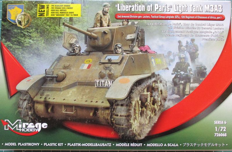 Bausatz: Die polnische Firma Mirage Hobby liefert schon seit längerem den Stuart in verschiedenen Versionen. Der M3A3 erscheint in der dritten Auflage. In der schön gestalteten Schachtel befindet sich fünf Gießäste, Gummiketten, ein Seil, ein kleiner Fotoätzteilbogen, die Bauanleitung sowie ein großer Abziehbilderbogen.