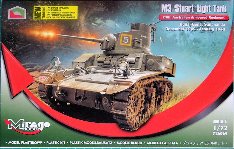 Bausatz: Mirage Hobby hat seinen M3 Stuart in der Version der australischen Armee herausgebracht. In der schön gestalteten Schachtel befinden sich die Bauanleitung, ein großer Abziehbilderbogen, Gummiketten, ein Seil, ein kleiner Fotoätzteilbogen sowie fünf Gießäste. Die Bauanleitung ist übersichtlich gestaltet und führt in neun Schritten zum fertigen Model.