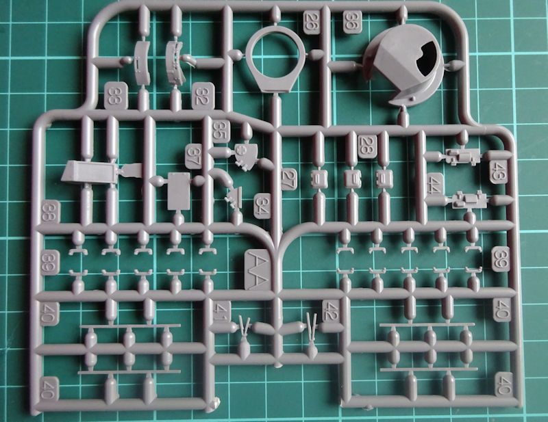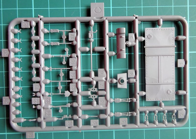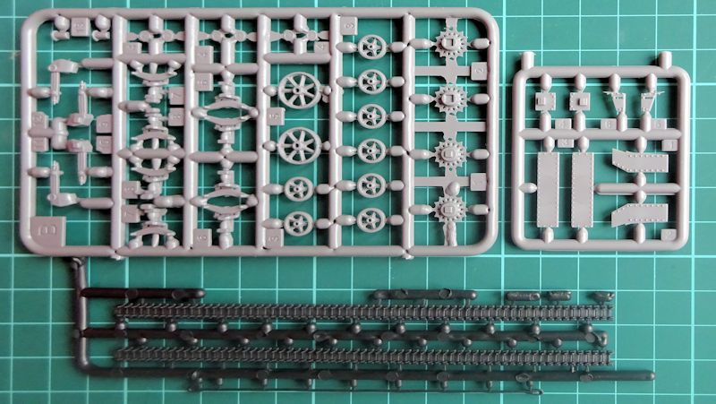 Alle Teile sind sauber und gratfrei wiedergegeben. Die Panzerplatten weisen eine schön gestaltete aufgeraute Oberfläche auf. Einige Teile sind leider etwas dick angegossen, so dass man gerade bei den Kleinteilen aufpassen muss, dass sie beim Abtrennen nicht brechen. Hervorzuheben ist das filigrane Fahrwerk. Weniger positiv ist die Gummikette.