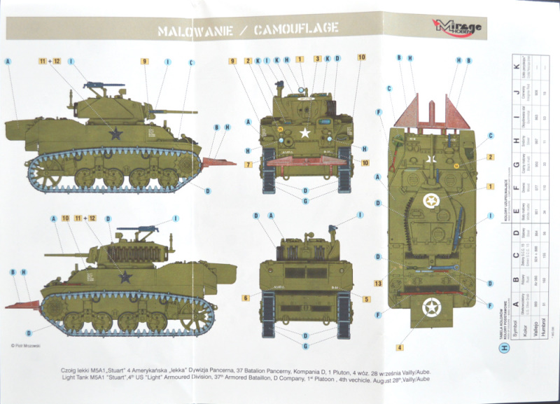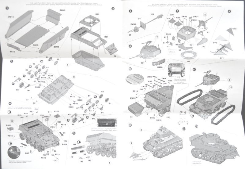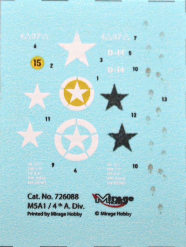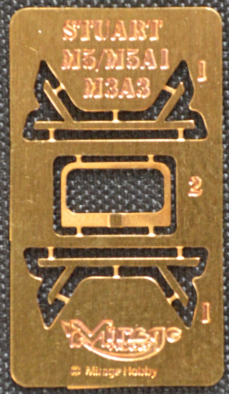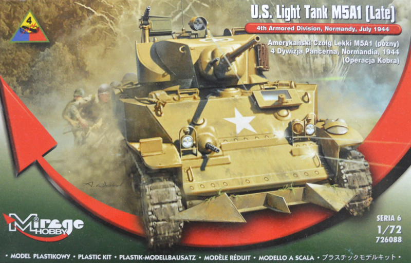 Bausatz: Die polnische Firma Mirage hat den M3 und M5 Stuart bereits in verschiedenen Ausfürungen herausgebracht. Dieser Bausatz stellt die späte US-Version mit Feldmodifikationen dar, wie sie in der Normandie 1944 von der 4. US-Panzerdivision genutzt wurden. Im stabilen Stülpkarton befinden sich 14 Spritzlinge aus grauem Plastik, drei Teile aus schwarzem Vinyl, drei Fotoätzteile, ein Decalbogen und eine farbige Anleitung. Die Teile sind in Short Run Formen gespritzt. Frühere M3-/M5-Modelle von Mirage wiesen viele Sinkstellen, Fischhäute sowie verwaschene Details auf. Mit Ausnahme des Spritzlings mit der Wannenoberseite wurden anscheinend alle Formen verbessert, denn diese besitzen nur vereinzelt kleine Fischhäute und weisen keine Auswerfermarken in sichtbaren Bereichen auf. Sinkstellen gibt es noch ein paar, aber bei Weitem nicht so viele wie bei früheren Bausätzen. Die Passgenauigkeit wirkt stimmig.