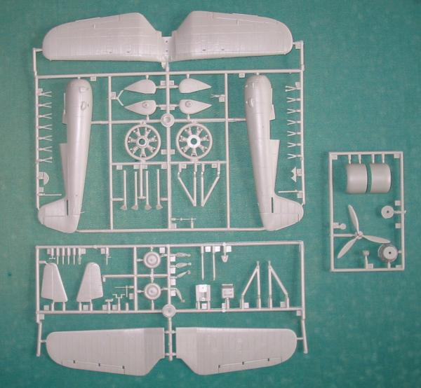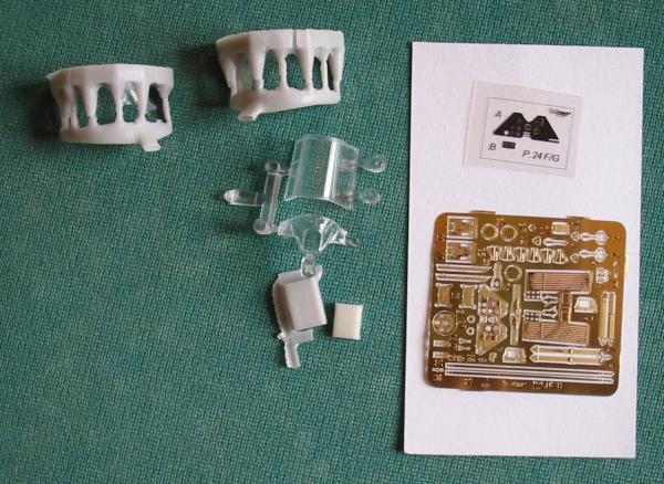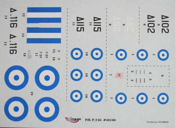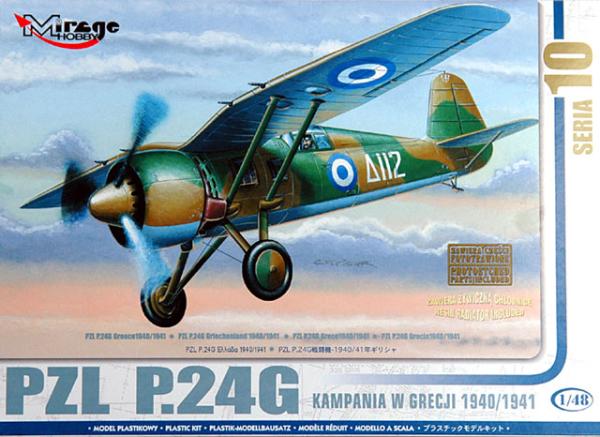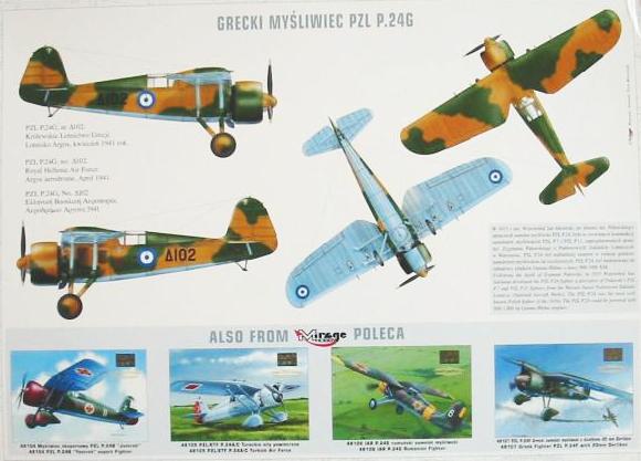 Der Bausatzsatz Nr. 48-108 der PZL P.24G enthält die für diese Version notwendigen 4 mal 7.92mm MG's. Eine Besonderheit des Bausatzes ist meiner Ansicht nach die Bauanleitung, die polnisch, englisch und griechisch gehalten ist, wohl eine Anpassung für den (Haupt-?)Absatzmarkt. Die Plastikteile präsentieren sich in der inzwischen von Mirage gewohnten Qualität und sind noch einen Tick besser als bei der PZL P.11. Es liegen wieder Resinteile für die Kühler und für die Abgassammler bei. Die Ätzteile sind vorwiegend für das Cockpit gedacht.