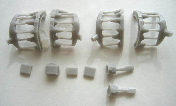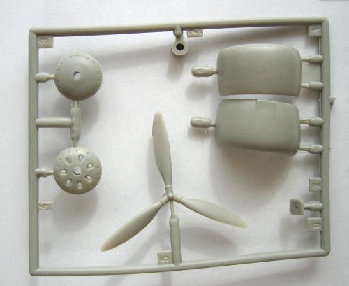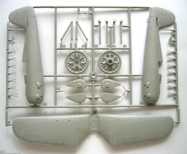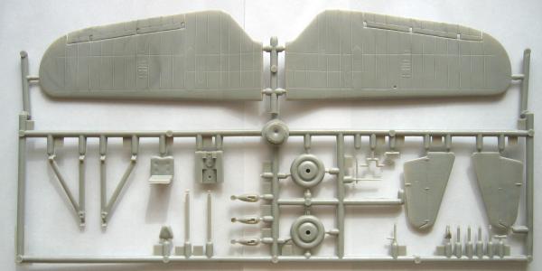 Der Bausatz besteht aus einem und zwei „halben“ Spritzlingen. Die Oberflächenstruktur ist sehr filigran ausgefallen. Besonders die der Tragflächen weis zu gefallen. Die notwendigen Entgratungsarbeiten halten sich in sehr erträglichen Grenzen. Mirage hat einen kleinen Ätzteilebogen und ein Stück Fotofilm für das Instrumentenbrett beigelegt. Die Glasteile sind als Spritzguss ausgeführt. Außerdem gehören zum Bausatz ein paar Resinteile für die Abgasanlage sowie den Kühler. Die Glasteile machen einen sehr guten Eindruck, wobei die Resinteile doch ein wenig nachbearbeitet werden müssen.
