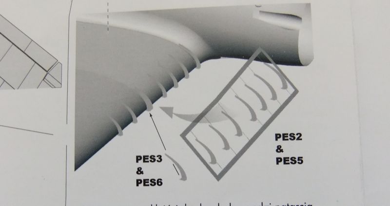 Dann wären da noch die vorderen Sturzflugbremsen. Diese sind vollständig aus dünnen, biegsamen Messing gefertigt. Und Mirage bietet die Halterungen komplett in einem Rahmen, wo sie vorsichtig in die richtige Position gebracht werden können. Danach wird der gesamte Rahmen an den Vorderflügeln befestigt und nach dem Aushärten des Sekundenklebers werden die Rahmen von den eigentlichen Halterungen getrennt. Vorflügel aufkleben, fertig.