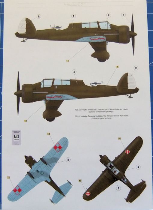 Bemalung: Vorgesehen sind zwei Möglichkeiten von der P.42. Einmal die Ausführung von dem technischen Institut für Luftfahrt in Warschau, April 1936 und eine Einsatzmaschine aus Deblin, 1939.