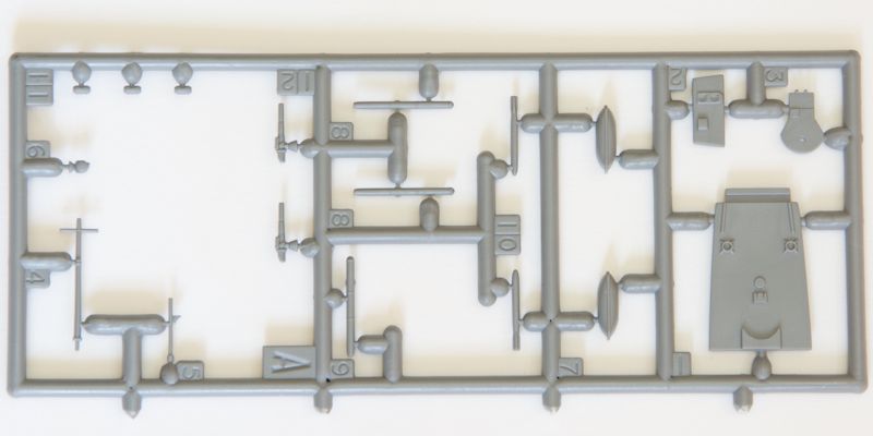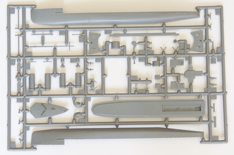 Der erste Gussast enthält Teile für den Rumpf, für die Decks, fürs Brückenhaus und weitere Kleinteile. Sie sind sauber gegossen und es gibt praktisch kein Grat. Im Vergleich zu neueren Bausätzen sind die Kleinteile und die am Deck angegossenen Details ein bisschen grob.