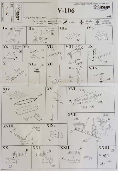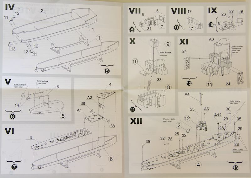 Der Bausatz enthält zwei Bauanleitungen. Eine für die Plastikteile und eine für die Fotoätzteile. Sie sind in schwarz-weiß einfach gezeichnet, aber klar und deutlich und mit Text auf Polnisch und Englisch versehen. Im Unterschied zu den meisten Bauanleitungen für Schiffsmodelle gibt es auch einen Plan für die Takelage, was einfach hervorragend ist.