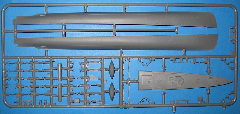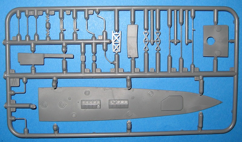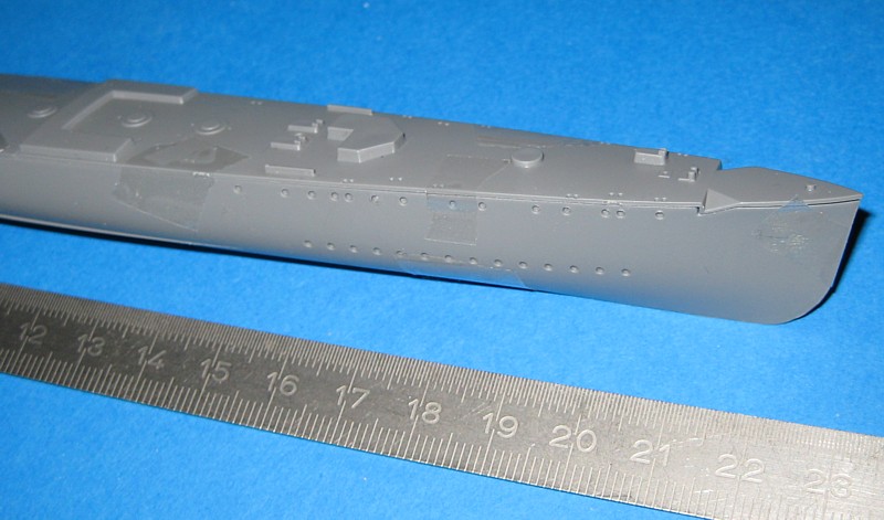 Der Rumpf ist zweiteilig als Vollrumpf ausgeführt und bietet eine gute Ausgangsbasis für das Modell. Bei sorgfältigem Zusammenbau lassen sich die Hauptabmessungen maßstäblich bis auf den Millimeter genau einhalten. Eine Umwandlung in ein Wasserlinienmodell ist bei der Größe des Modells ratsam, denn oft sehen Ständermodelle dieser Größe wie Modelle von größeren Modellen aus, aber letztendlich entscheidet natürlich der persönliche Geschmack. Ein Abtrennen des Unterwasserschiffes sollte selbst einen ungeübten Modellbauer nicht überfordern.