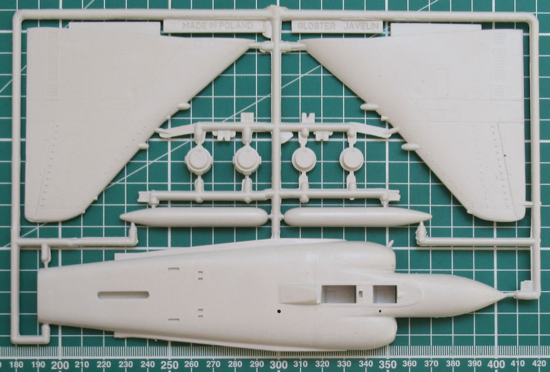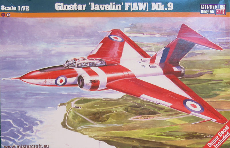 Bausatz: Die Gloster Javeline FAW Mk. 9 erschien 1975 bei FROG als Neuheit im Maßstab 1/72. Danach erschien dieser Bausatz unter den verschiedenen Labels und nun ist die Form bei MisterCraft in Polen gelandet. In einem attraktiven aber etwas labbrigen Stülpkarton befinden sich gut verpackt vier graue Spritzlinge mit 61 Teilen, ein Klarsichtteil, zwei Decalbögen und die mehrfarbige Bau- und Bemalungsanleitung. Das Alter der Form erkennt man an den Spritzgrussteilen. Die Form weist diverse Kratzer auf und Grat gehört bei einigen Teilen zum Standard. Immerhin gibt es einige versenkte Strukturen.