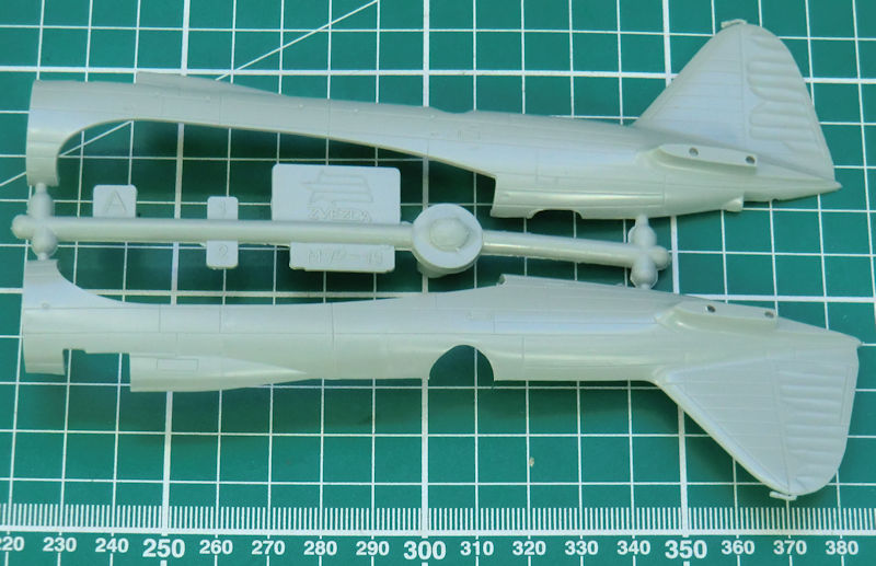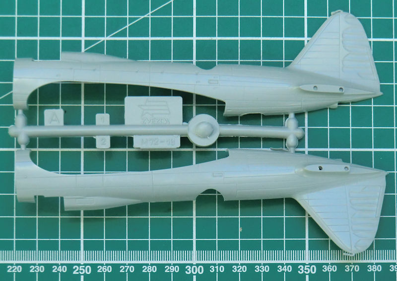 Bausatz: Die Iljuschin Il-4 erschien um 1990 bei Plasticart in 1/72 und in den 1990er Jahren gab es in Russland einen Bausatz der DB-3 und der DB-3F/Il-4 aus eigener Produktion. Den letzteren Kit hat jetzt MisterCraft im Angebot. Auf den Spritzlingen ist immer noch Zvezda zu lesen… In dem attraktiven praktischen Stülpkarton befinden sich gut verpackt drei graue Spritzlinge mit 78 Einzelteilen, ein Klarsichtrahmen mit sieben Teilen, zwei Decalbögen und die mehrfarbige Bau- und Bemalungsanleitung. Die Form hat in den letzten 20 Jahren schon ein wenig gelitten. Es gibt hier und da ein wenig Grat. Immerhin besitzen die Teile schöne versenkte Strukturen.