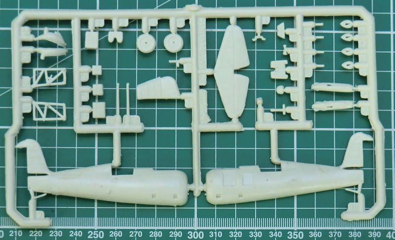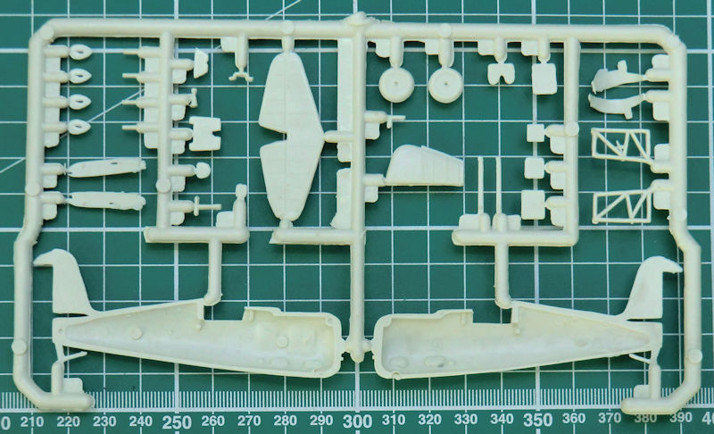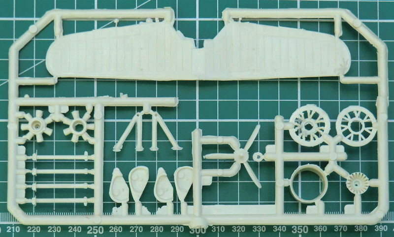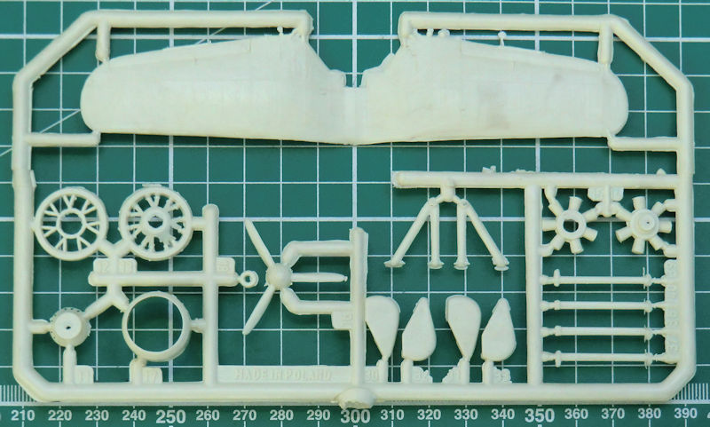 Tragfläche, Höhenleitwerk und das Seitenruder bestehen aus jeweils ein Stück. Daher erhält man auch scharfe Hinterkanten. Der Motor entsteht aus vier Teilen. Die Luftschraube besteht aus einem Stück. Die Hauptfahrwerksräder sehen etwas einfach aus. Aber das Fahrwerk kann mit oder ohne Verkleidung bauen. Beim Einbau der Bewaffnung muss man sich für eine passende Bemalungsoption entscheiden. Leider gibt es nur eine sehr dicken einteilige Klarsichthaube.