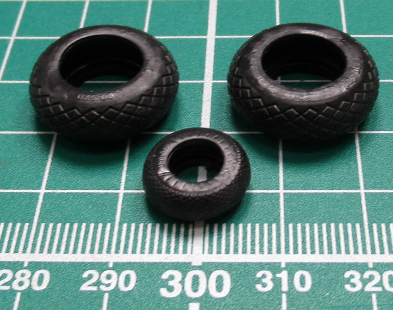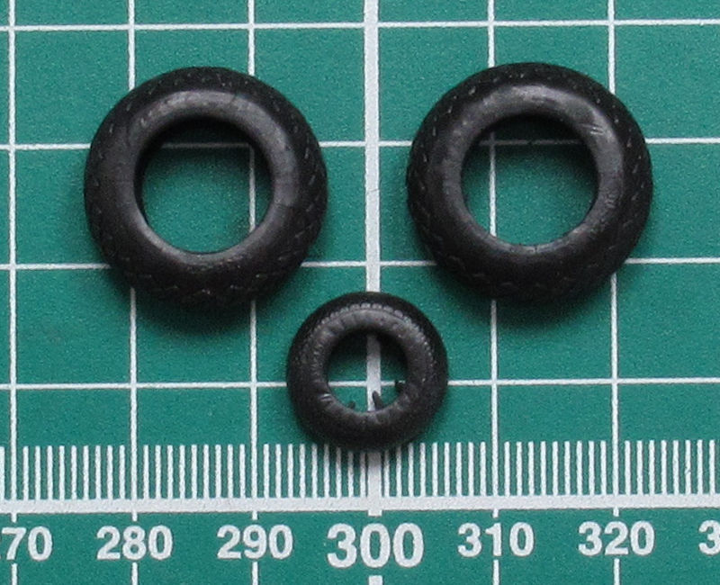 Der Bau beginnt mit dem Cockpit. Das ist sehr gut ausgestattet. Für das Instrumentenbrett und die Bedienungskonsolen gibt es Decals. Ein paar Sitzgurte kann man noch ergänzen. Die Gummireifen werden schon in den Bauschritten 9/10 auf die passenden zwei Hälften der Felgen gezogen. Sie haben zwar ein schönes Profil. Nachteilig ist immer der mit Weichmacher behaftete Gummi…