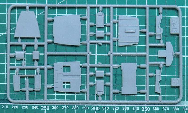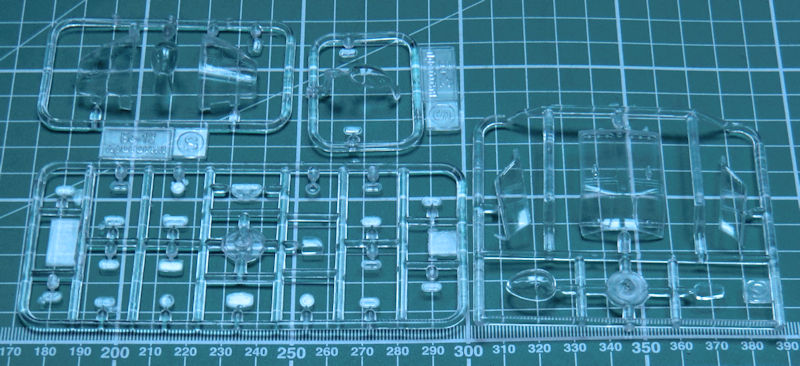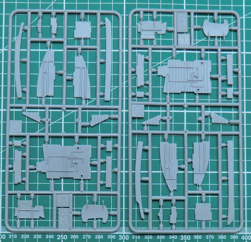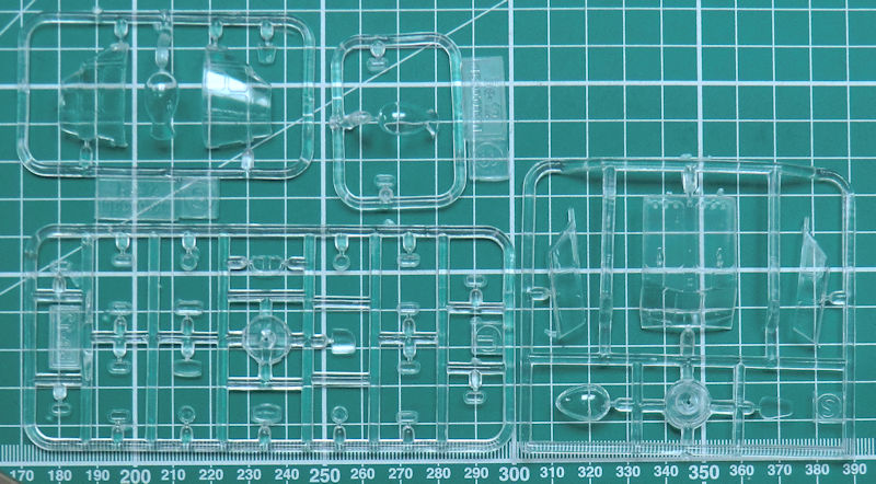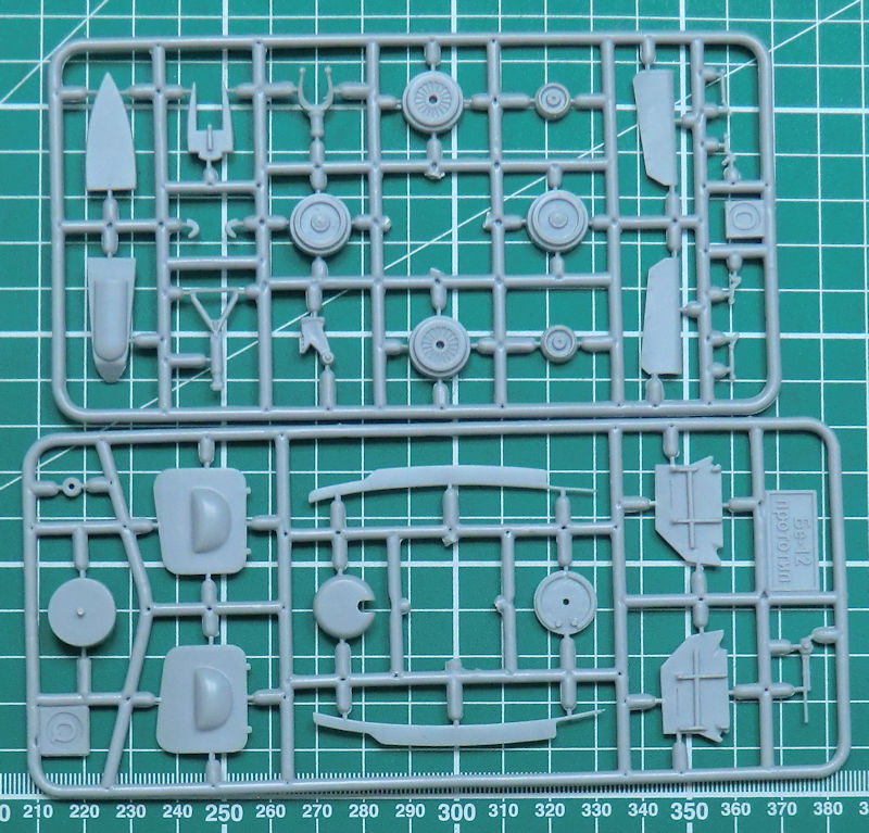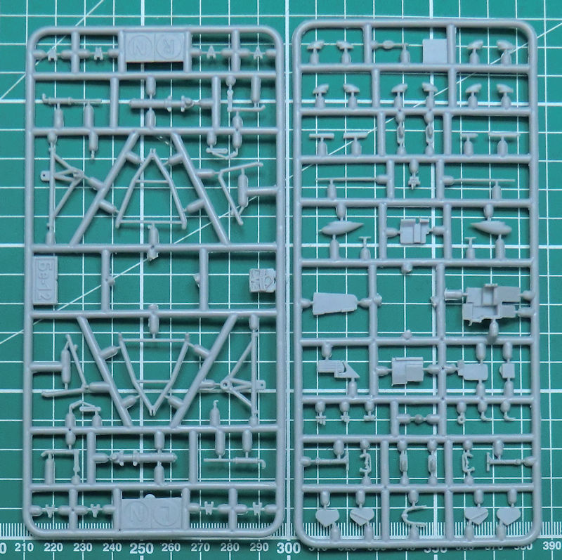 In dem attraktiven praktischen Stülpkarton befinden sich gut verpackt 19 hellgraue Spritzgussrahmen oder Großbauteile mit 215 Teilen, vier klare Spritzgussrahmen mit 32 Teilen, drei Gummireifen, ein kleiner Fotoätzteilbogen mit zwölf Teilen, Vinylmasken, ein Decalbogen und die mehrfarbige Bau- und Bemalungsanleitung.