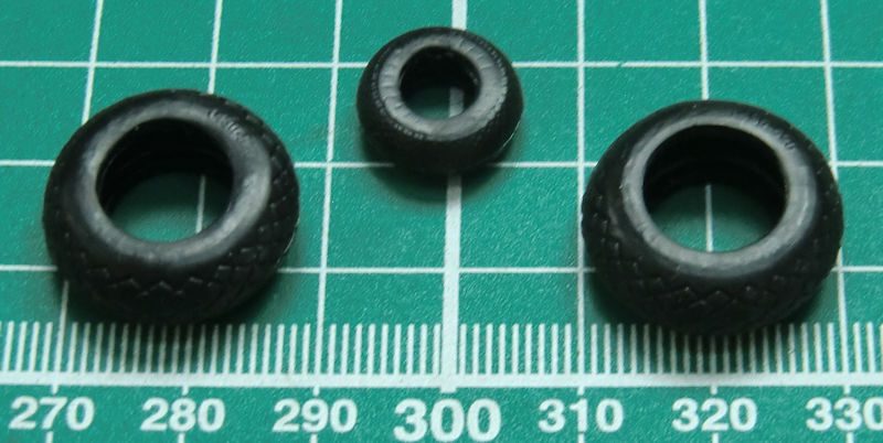 Der Bau beginnt mit dem Cockpit. Das ist sehr gut ausgestattet. Für das Instrumentenbrett und die Bedienungskonsolen gibt es Decals. Ein paar Sitzgurte kann man noch ergänzen. Die Gummireifen werden schon in den Bauschritten 8/9 auf die passenden zwei Hälften der Felgen gezogen. Sie haben zwar ein schönes Profil. Nachteilig ist immer der mit Weichmacher behaftete Gummi…