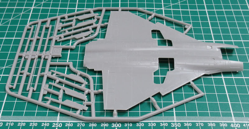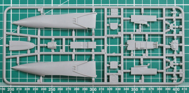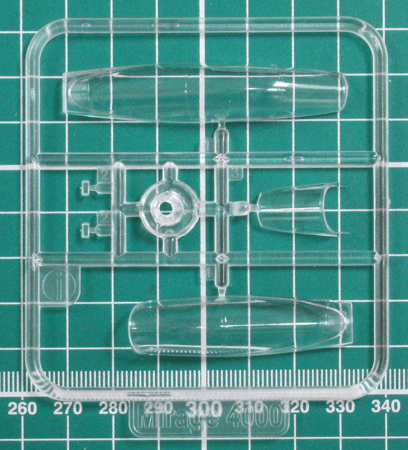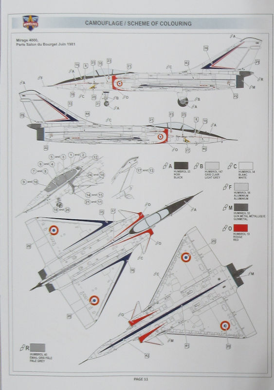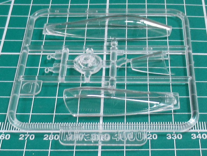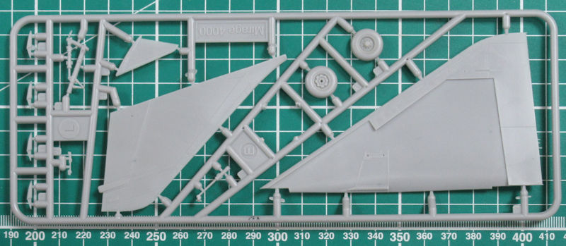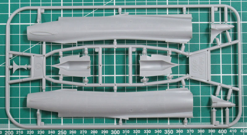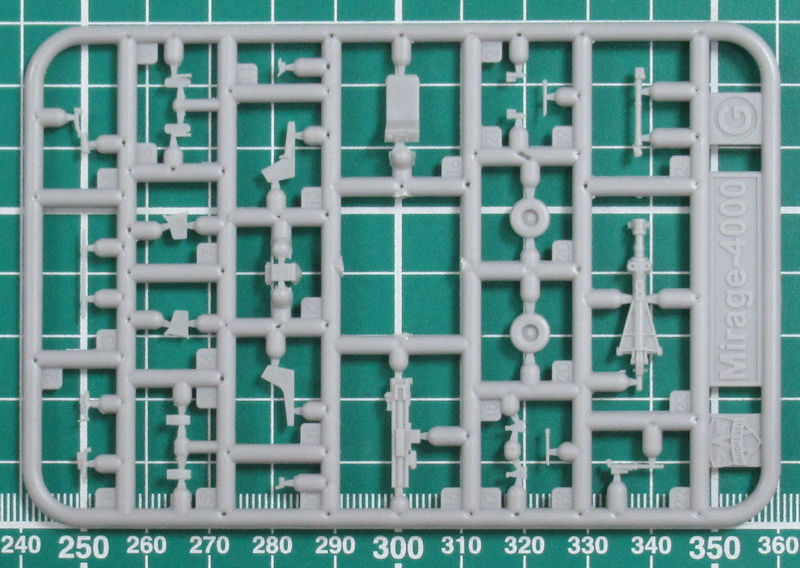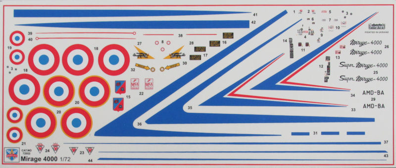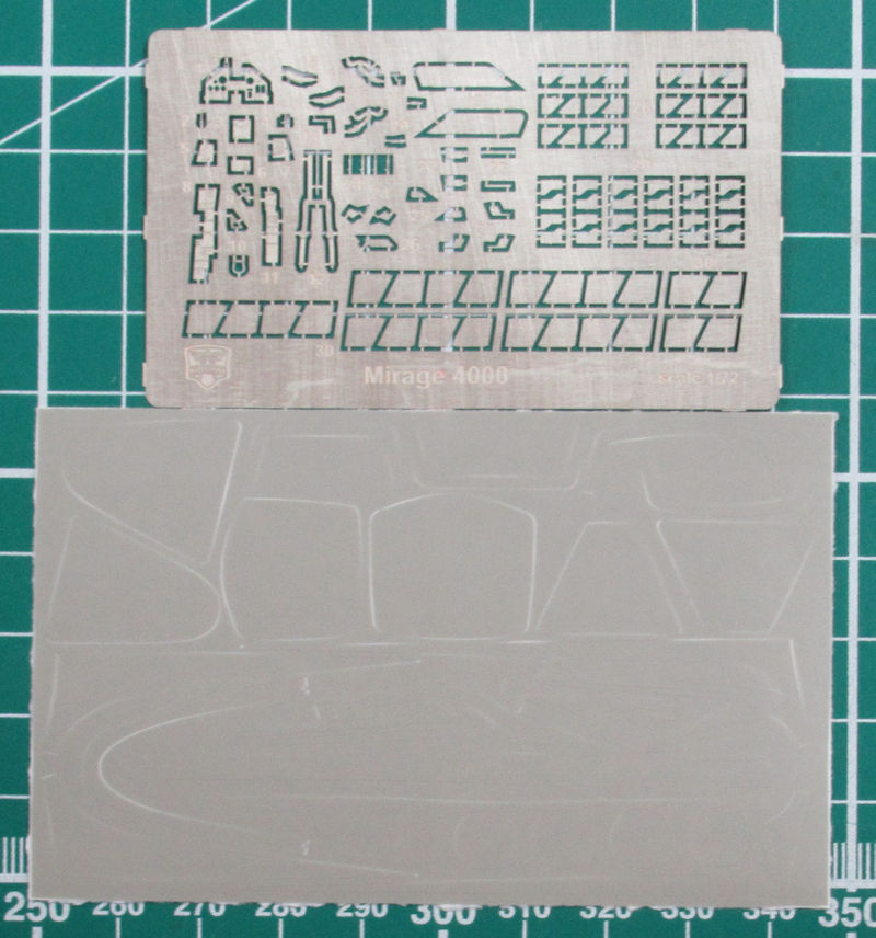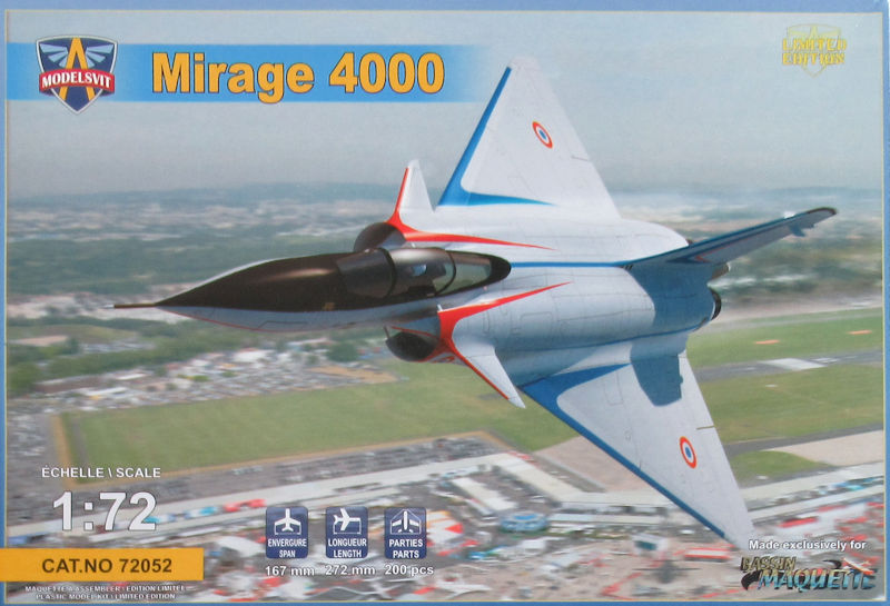 Bausatz: Dieser Bausatz entstand offensichtlich auf Wunsch des französischen Händlers Bassin Maquette. So liefert modelsvit hier einen typischen Short-Run-Bausatz der Dassault Mirage 4000 im Maßstab 1/72. In dem attraktiven praktischen Stülpkarton befinden sich sehr gut verpackt sieben hellgraue Spritzlinge mit 122 Teilen, ein klarer Spritzling mit fünf Teilen, ein Fotoätzteilbogen, ein Bogen mit Vinylmasken, ein Decal und die mehrfarbige Bau- und Bemalungsanleitung.