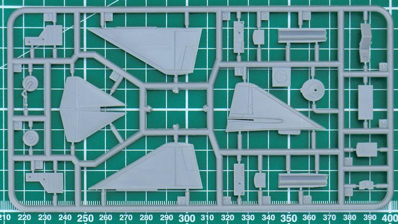 Die Tragflächenhälften, Seiten- und Höhenleitwerk bestehen aus jeweils einem Teil. Das sorgt für scharfe Hinterkanten. Die Stützräder und die Fahrwerksklappen ergänzen die Konstruktion. Die Kanzel besteht leider aus nur einem Stück.