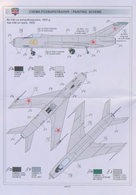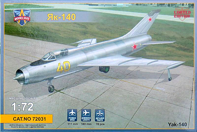Vorbild: Die Jakowlew Jak-140 war ein kleines leichtes Jagdflugzeug der 1950er Jahre. Es entstand in der UdSSR um das Mikulin AM-11 Strahltriebwerk. Damit sollte eine Höchstgeschwindigkeit von bis zu 1750 km/h erreicht werden. Als Bewaffnung waren drei 30mm-Kanonen vorgesehen und 200 kg Bomben möglich. Der Prototyp stand ab Februar 1955 für Bodentests bereit. Dann wurde das Programm gestrichen.