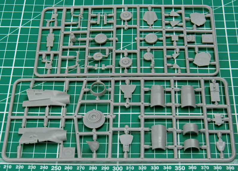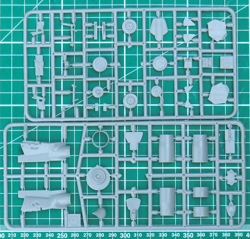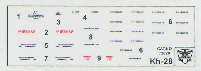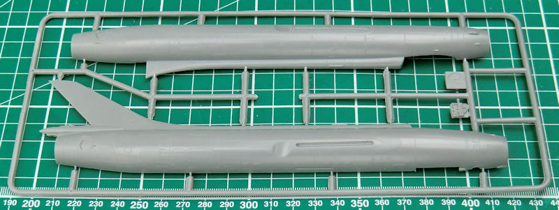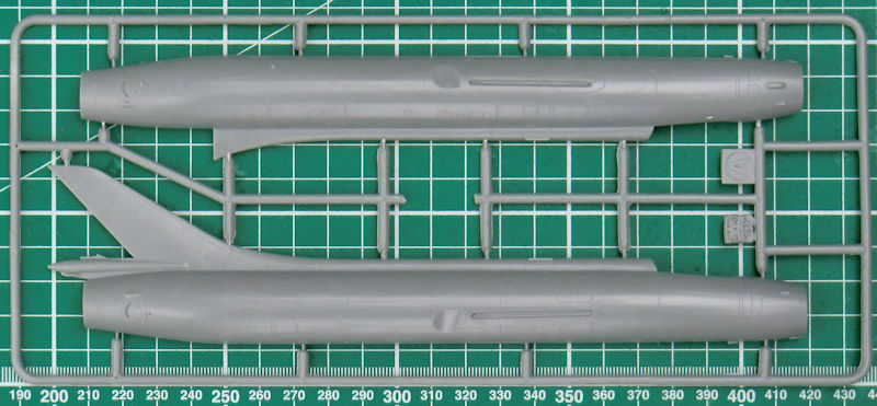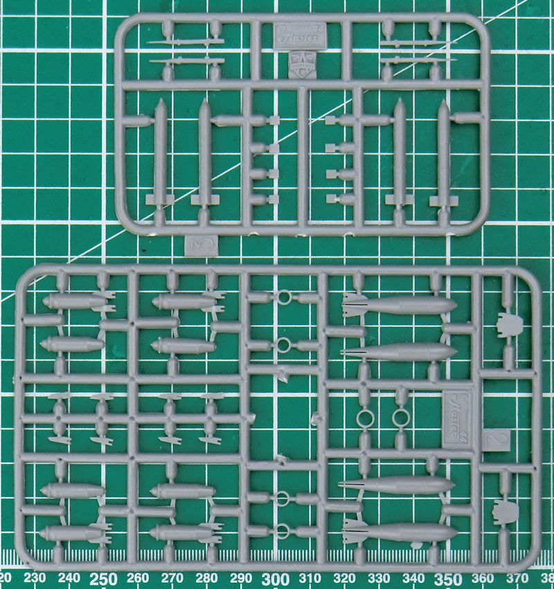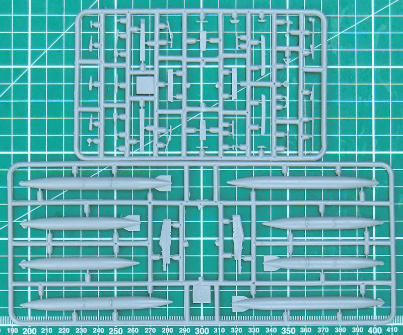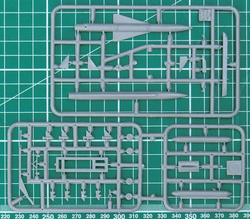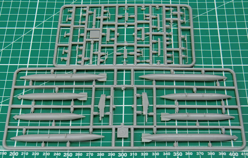 Das Hauptfahrwerk ist sehr stabil und ist ausreichend detailliert. Aus jeweils zwei Teilen entstehen die Hauptfahrwerksräder. Die passenden Klappen besitzen schöne Strukturen. Als Montagehilfe gibt es eine passende Frontansicht. Als Außenlasten gibt es Zusatztanks, Raketen S-24, Freifallbomben FAB-250 sowie FAB-500 und vor allem die Lenkwaffe Kh-28 samt Transportwagen.