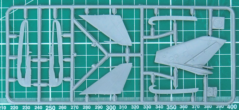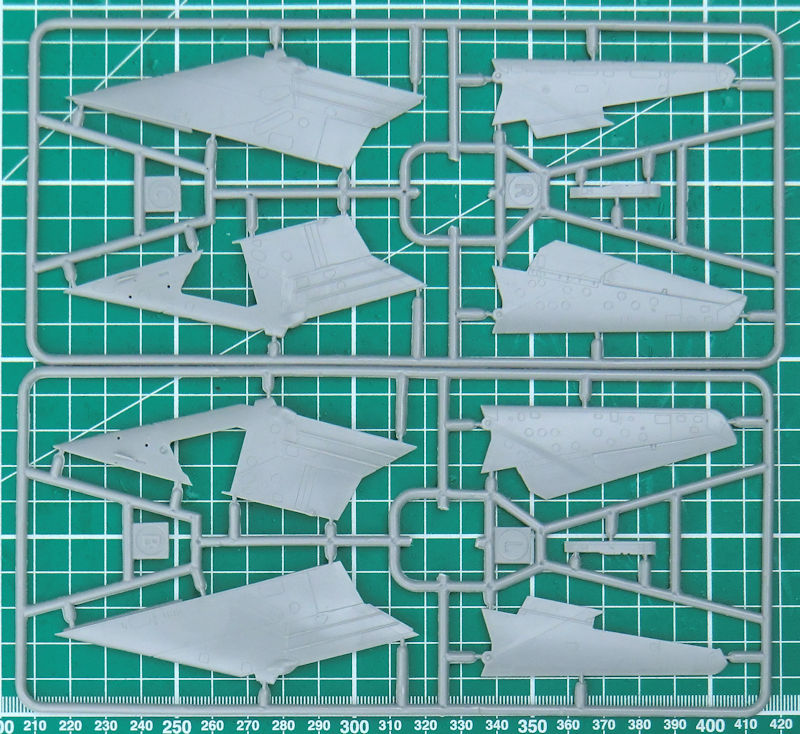 Der Triebwerksauslass ist auch innen detailliert. Wichtig ist nur, dass man das Schubrohr aus drei Teilen auch rund zusammenbekommt. In den Fahrwerksschächten gibt es innen auch schöne Strukturen. Die Tragfläche und die Ruder haben scharfe Hinterkanten. Die zwei Grenzschichtzäune werden einzeln aufgeklebt. Sie sind trotzdem sehr dünn. Die großen Abschlussplatten werden über die äußeren Flügel geschoben und festgeklebt. Alle Ruder haben scharfe Hinterkanten. Etwas einfach sehen die kleinen Lufteinläufe für den Rumpf aus. Hier muss man entweder die Öffnungen aufbohren oder etwas passendes im Zubehörhandel suchen.