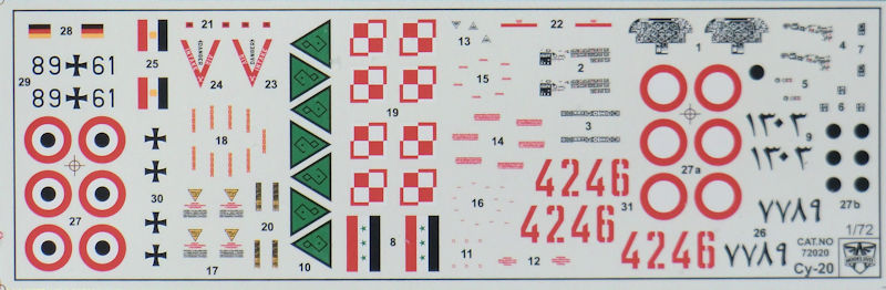 Bausatz: Der ukrainische Hersteller modelsvit liefert in 1/72 diverse Bausätze der Su-7/Su-17/Su-22-Reihe. So gibt es auch den Exportableger Su-20 als Short-Run-Kit. In dem stabilen Stülpkarton befinden sich gut verpackt zwölf graue Spritzlinge mit 177 Teilen, ein klarer Spritzling mit fünf Teilen, drei Decalbögen und die mehrfarbige Bau- und Bemalungsanleitung.