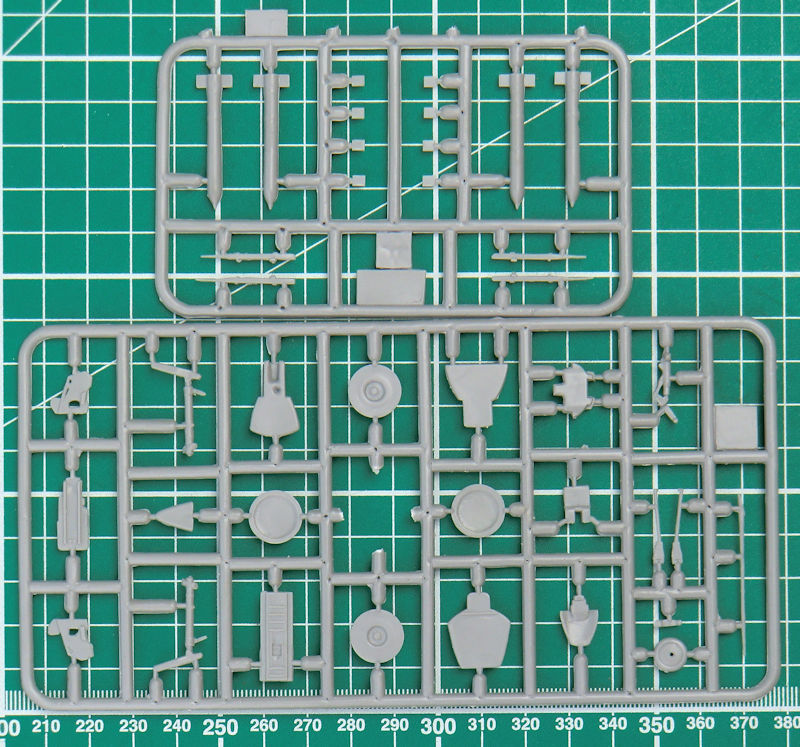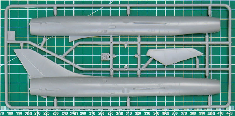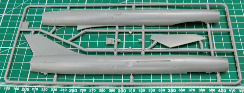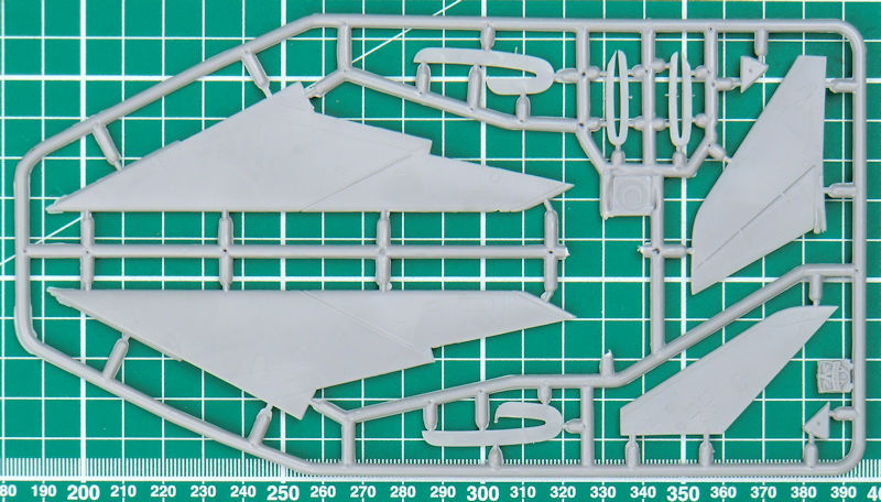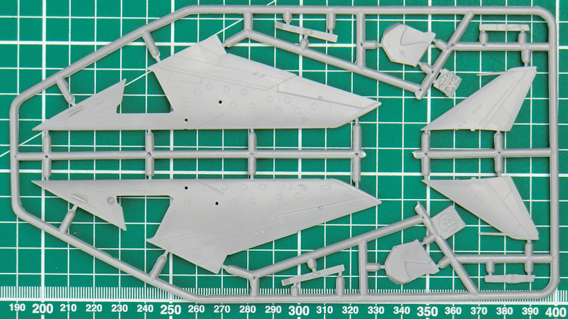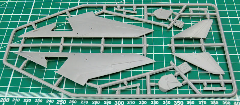Die Spritzgussteile haben feine versenkte Strukturen. Trotzdem darf man nicht vergessen, dass wir es hier mit einem Short-Run-Bausatz zu tun haben. Das Cockpit ist gut detailliert. Der Schleudersitz besteht aus vier Einzelteilen. Man sollte allerdings noch die Sitzgurte ergänzen. Die Instrumente werden mittels Decals dargestellt. Das Bugfahrwerk wird samt Schacht unters Cockpit geklebt. Der Konus im Lufteinlauf besteht aus einem Stück. Irgendwie sieht der bisschen "weich" aus. Allerdings gibt es ein Metallstück im Zubehörmarkt… Damit hätte man vielleicht auch ein Gegengewicht im Bug.