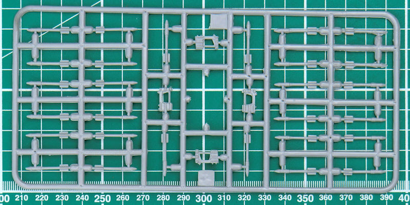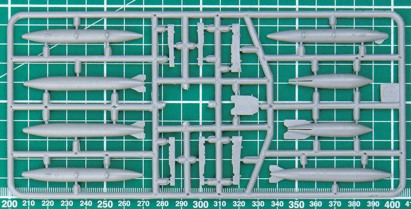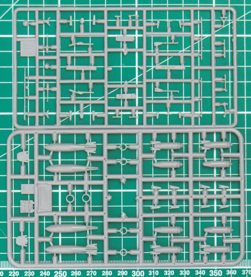 Das Hauptfahrwerk ist sehr stabil und ist ausreichend detailliert. Aus jeweils zwei Teilen entstehen die Hauptfahrwerksräder. Die passenden Klappen besitzen schöne Strukturen. Als Montagehilfe gibt es eine passende Frontansicht. Als Außenlasten gibt es zwei Zusatztanks, Raketen S-24, Freifallbomben FAB-250 sowie FAB-500 und S-3K-Raketen.