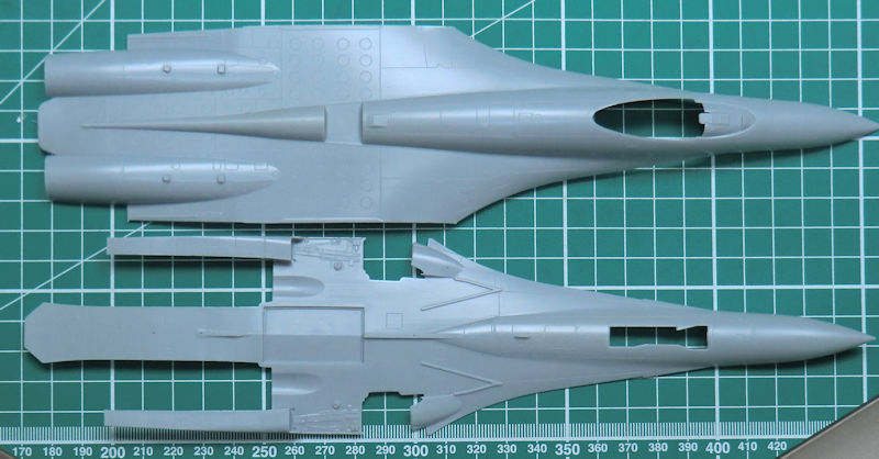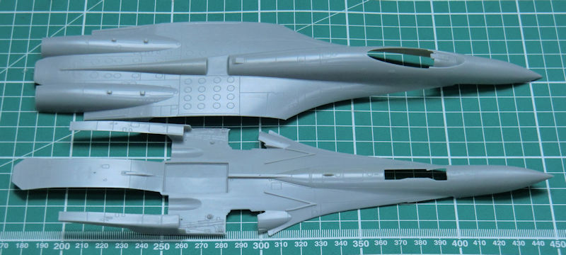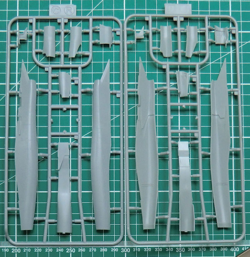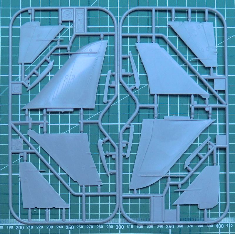 Bei den beiden Triebwerksauslässen hat modelsvit auch innen einen guten Job gemacht. Allerdings müssen diese aus drei Teilen ein rundes Abgasrohr ergeben. Bei den Lufteinläufen sind es auch ein paar mehr Teile die ein Ganzes ergeben. Dafür ist es bei den Tragflächen einfach. Die scharfen Hinterkanten und die Enden sind auf einer Seite vereint.
