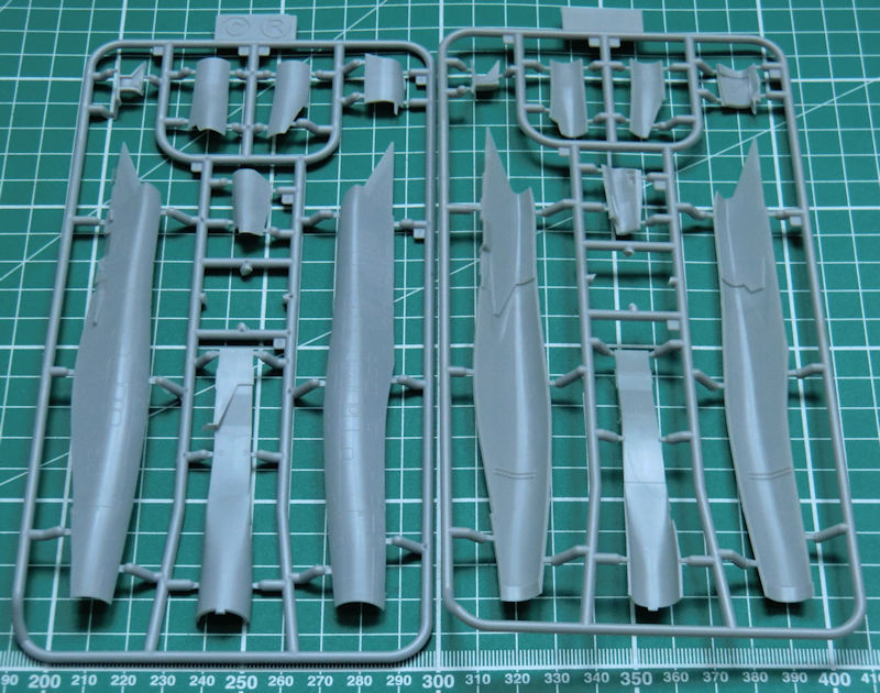 Die Fahrwerksschächte bekommen sehr struktureiche Innenteile und dazu passen die detaillierten Beine samt Räder. Ganze zwei Gramm sollen in der Bugspitze als Gegengewicht dienen. Den Zusammenbau des Modells wird durch zahlreihe zusätzliche Skizzen erleichtert. Natürlich gibt es bei Seiten- und Höhenruder auch scharfe Hinterkanten.