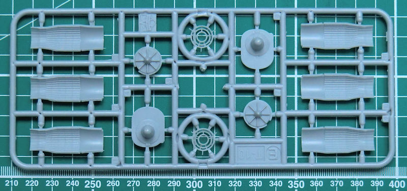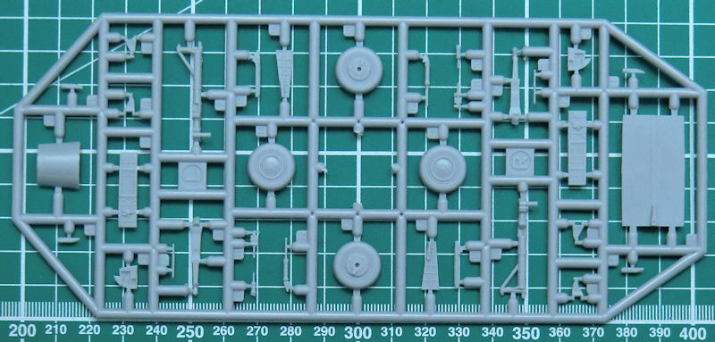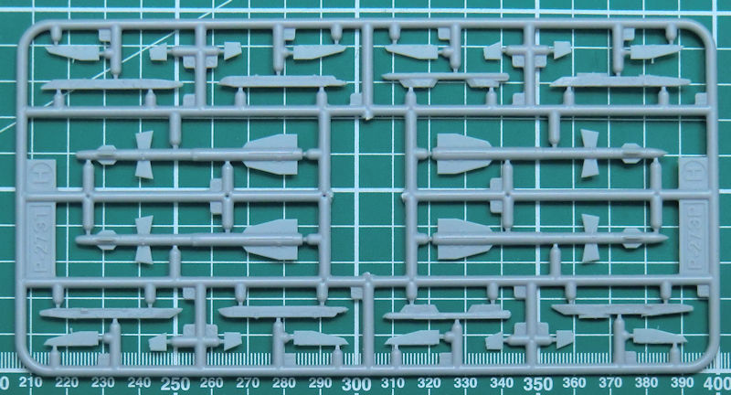 In dem stabilen praktischen Stülpkarton befinden sich gut verpackt zwölf graue Spitzlinge oder Großbauteile. Das sind in der Summe 133 Teile. Dazu kommen acht Klarsichtteile, ein kleiner Fotoätzteilbogen, ein Fotofilm, Vinylmasken, ein kleiner Decalbogen und die mehrfarbige Bau- und Bemalungsanleitung.
